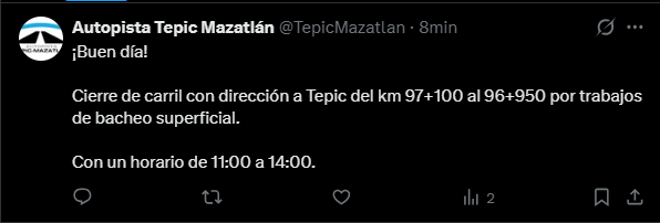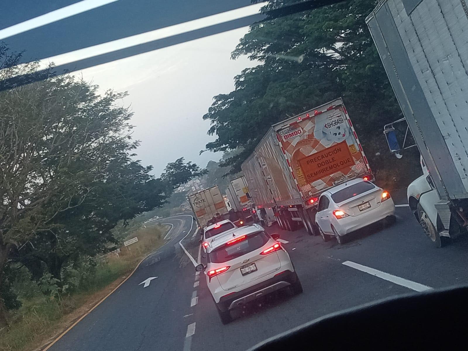 A esto se suma el cierre de carril con dirección a Tepic del kilómetro 97+100 al 96+950, por trabajos de bacheo superficial programados en un horario de 11:00 de la mañana a 2:00 de la tarde, lo que complica aún más la circulación y contribuye a la lentitud en el avance de los vehículos en esa zona.
