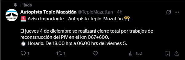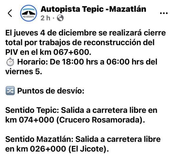 La autopista Tepic?Mazatlán tendrá un cierre total nuevamente desde las 6:00 de la tarde de este jueves hasta las 06:00 de la mañana del viernes 5 diciembre, por trabajos de reconstrucción del paso inferior vehicular ubicado en el kilómetro 67+600.