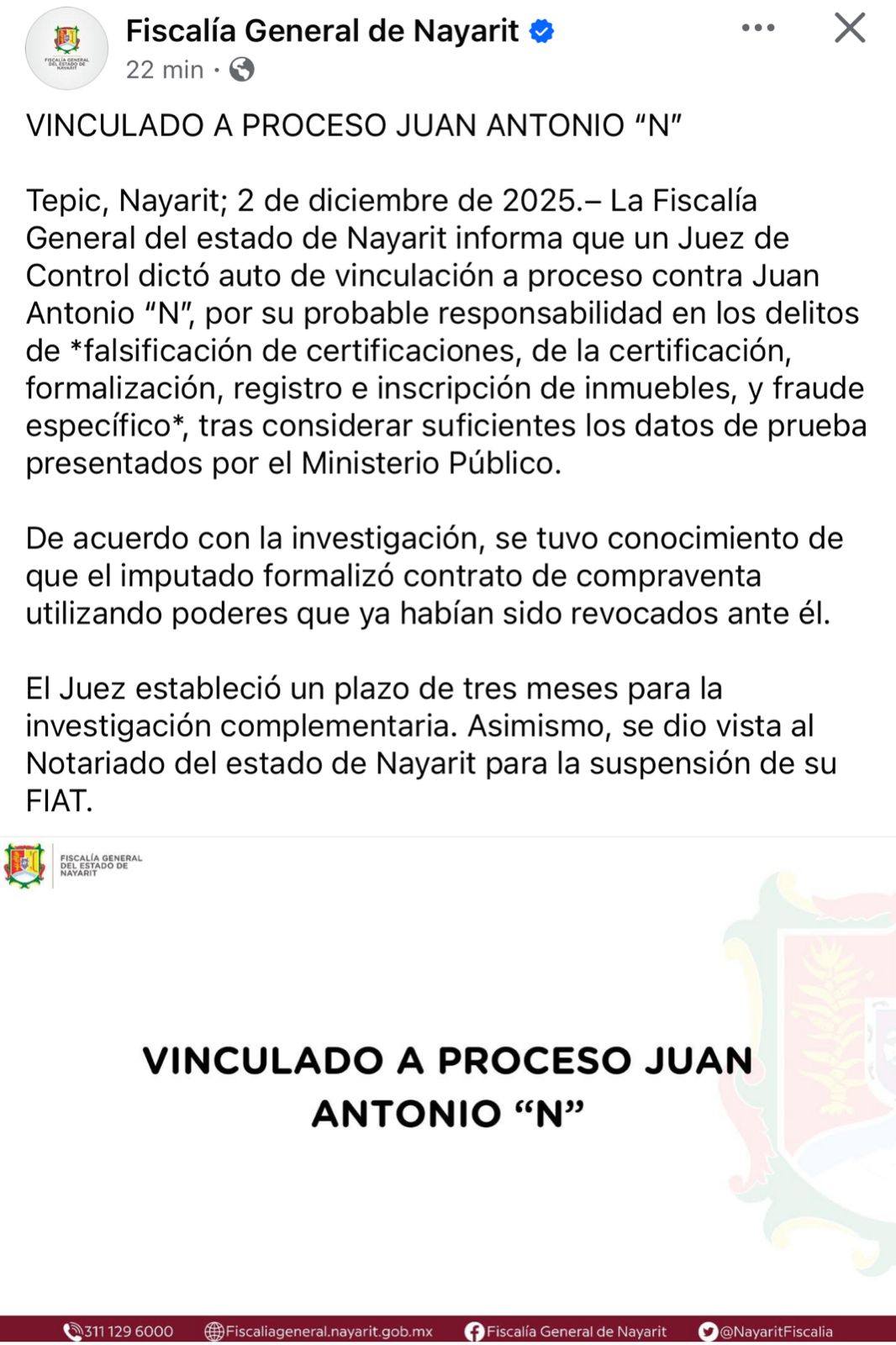 Además de la vinculación a proceso, se determinó que el Notariado del estado de Nayarit debería suspender el FIAT de Juan Antonio "N". Este documento es fundamental para que un notario pueda ejercer su función legalmente, por lo que su suspensión, si se confirma la culpabilidad del acusado, podría impedir que continúe trabajando como notario público en la región.