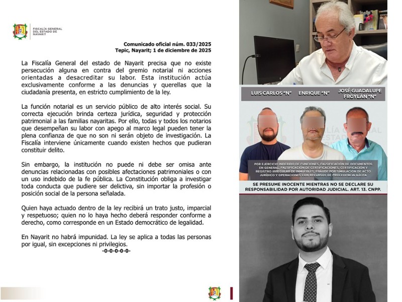 Fiscalía aclara operativos contra notarios; silencio sobre abogado detenido por presentar amparos