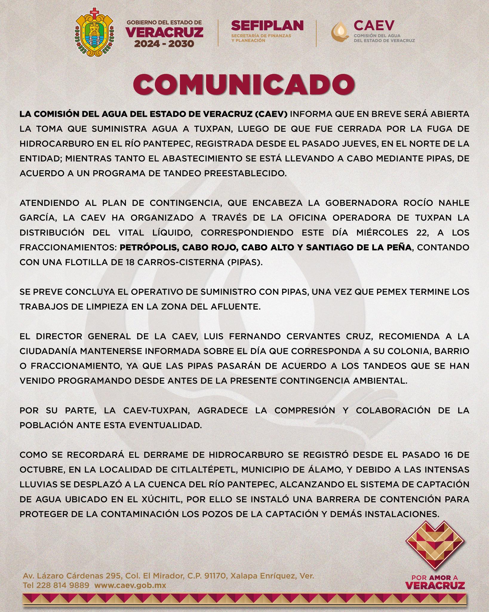 La Comisión del Agua del Estado de Veracruz (CAEV) informó que mientras reactivan el servicio de agua suspendido por el derrame de hidrocarburo , el abasto se estará efectuando mediante pipas, siguiendo un programa de tandeo previamente establecido.