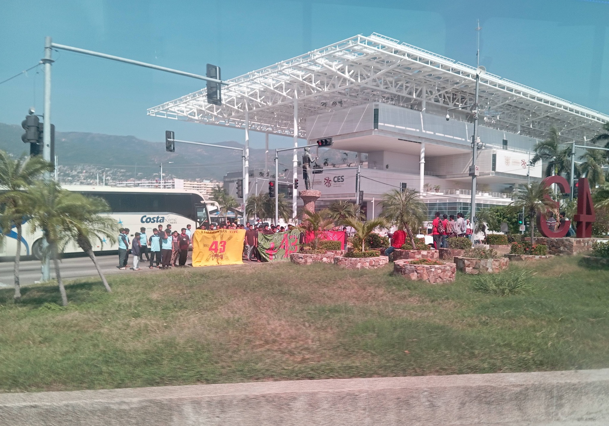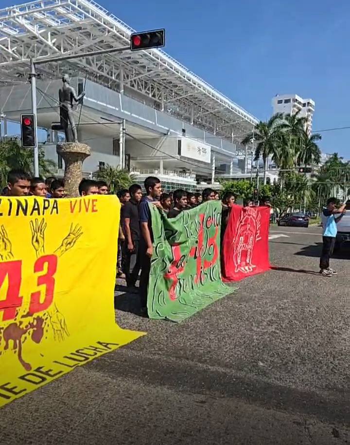 Este martes, alrededor de 80 estudiantes de la Normal Rural de Ayotzinapa se manifestaron en el Antimonumento a los 43 de Acapulco para señalar que la presidenta Claudia Sheinbaum no le interesa aclarar los hechos del caso Ayotzinapa.