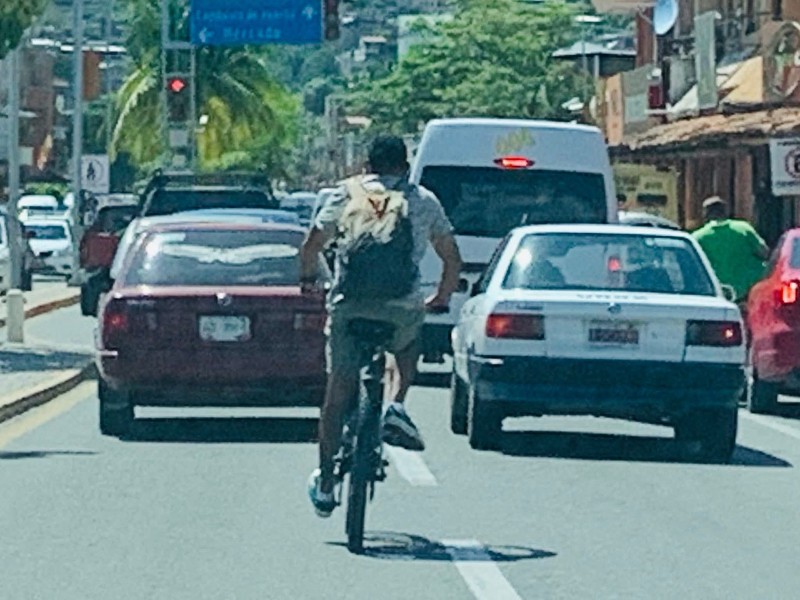 Ciclistas conducen entre vehículos sin equipo de protección personal