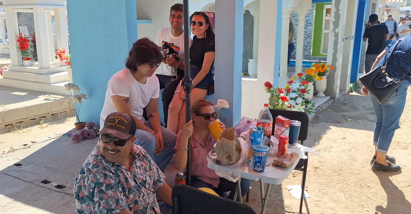 La familia Gálvez acudió, como cada año, a visitar la tumba de su abuela. Llevaban comida y bebidas para compartir junto a ella, como parte del homenaje que conservan desde hace años. "Ahorita trajimos empanadas, la Coca-Cola nunca falta aunque no es nada sano y también el café", contó Roberto Gálvez, quien asistió acompañado de su familia, su novia, sus tíos y "Chita", la perrita que pertenecía a su abuela.
