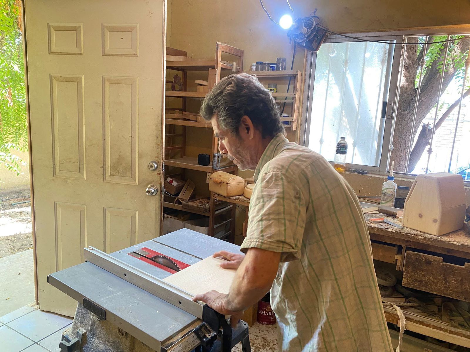 En su pequeño taller, ubicado en la colonia Santa Fe, el sonido de la sierra eléctrica y el aroma a madera recién cortada acompañan sus jornadas. Con precisión admirable, fabrica mesas, sillas y utensilios que hoy forman parte de distintos hogares paceños.