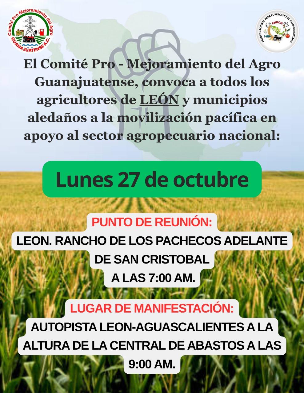 Entre los puntos que van a presentar cierres a la vialidad están la autopista León - Aguascalientes a la altura de la caseta de Santa Rosa a las 9 de la mañana, también habrá cierre a la altura de la Central de Abastos, otro punto anunciado es en la carretera Silao ? León a la altura del Puerto Interior, la convocatoria también destaca la participación de campesinos de Irapuato a la altura de las gasolineras gemelas en la zona de Rancho Grande.