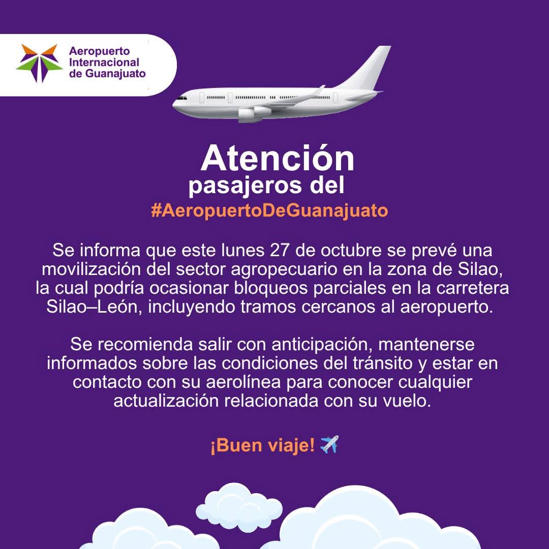 En tanto el aeropuerto Internacional de Guanajuato a enviado en redes sociales un alertamiento a los usuarios para los viajeros que tienen agendado vuelo para este lunes 27 para que tomen las medidas pertinentes y no verse afectados por los posibles bloqueos a la vialidad cercana a la central aérea.