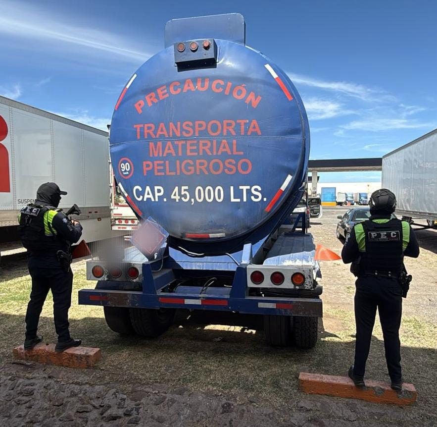 Integrantes de la Policía Estatal de Caminos, adscrita a las Fuerzas de Seguridad Pública del Estado (FSPE), aseguraron un remolque tipo pipa con 45 mil litros de hidrocarburo, en aparente abandono y con una fuga en la escotilla lateral derecha sobre la carretera Celaya?Dolores Hidalgo.