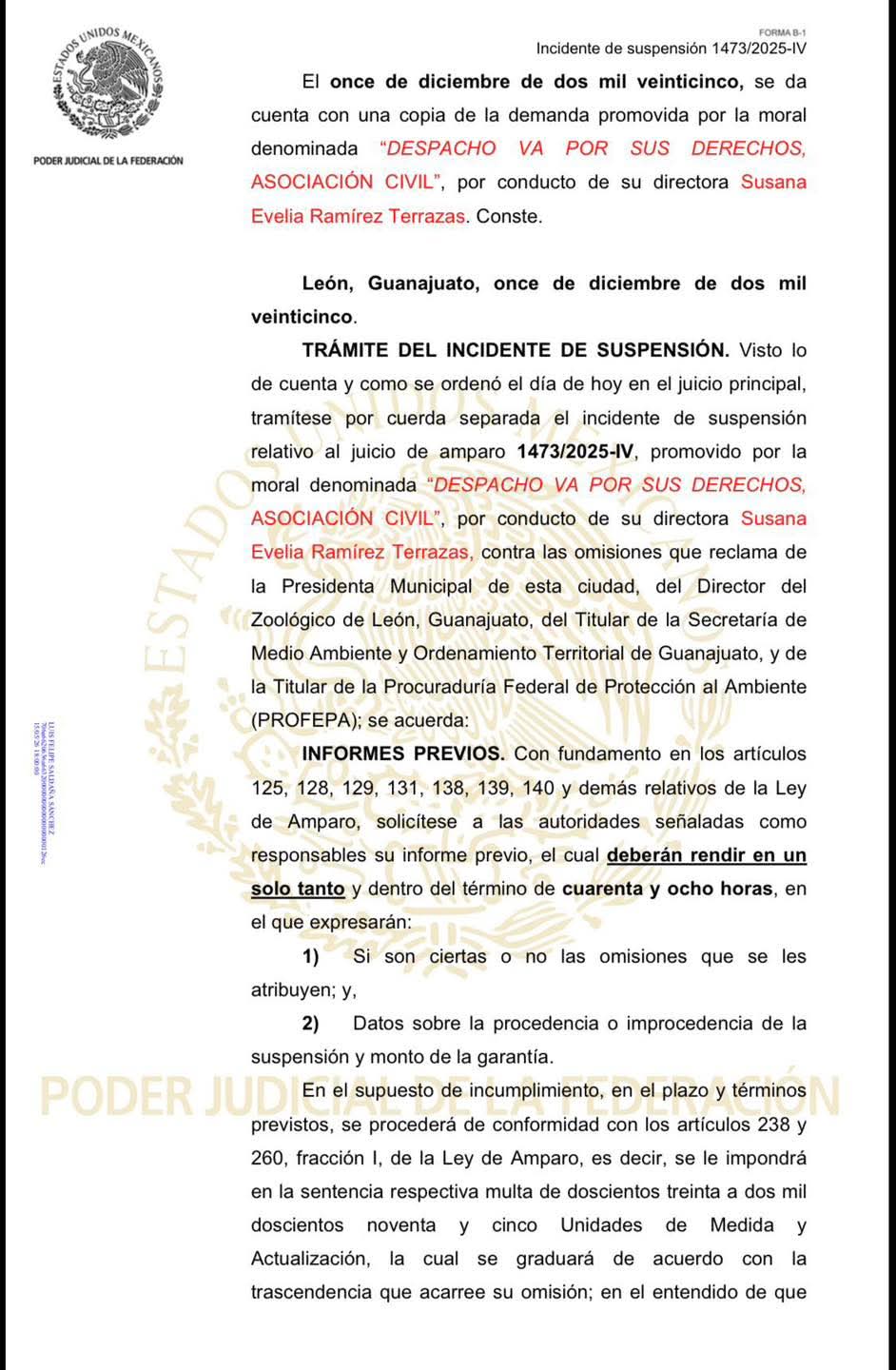 El juicio de amparo, identificado con el expediente 1473/2025, se tramita en el Juzgado Décimo Segundo de Distrito en Guanajuato. De acuerdo con la resolución, la suspensión tiene como fin exclusivo garantizar el bienestar de los animales y la seguridad de los visitantes.