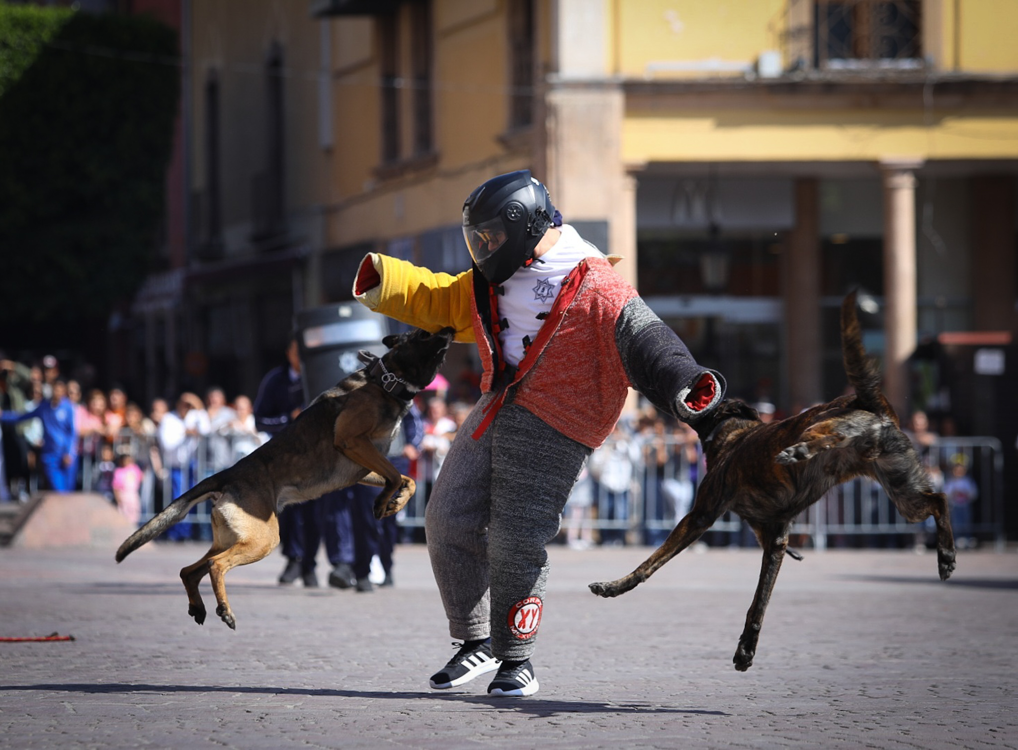 Las corporaciones de seguridad abrieron el paso; Pero el momento que encendió el ánimo fue la demostración del grupo K9, cuyos binomios realizaron una intervención táctica que desató gritos, aplausos y celulares levantados para grabar cada movimiento.