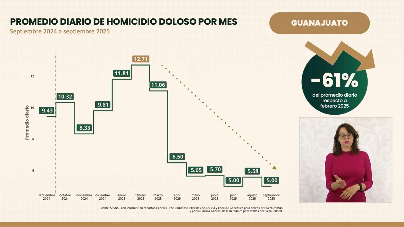 Esta tendencia dijo se ha presentado sostenida desde hace 7 meses de este 2025, en marzo se tenían 11.6 homicidios diarios, en abril se tuvo una disminución de casi la mitad al llegar a 6.5 asesinatos por día.
