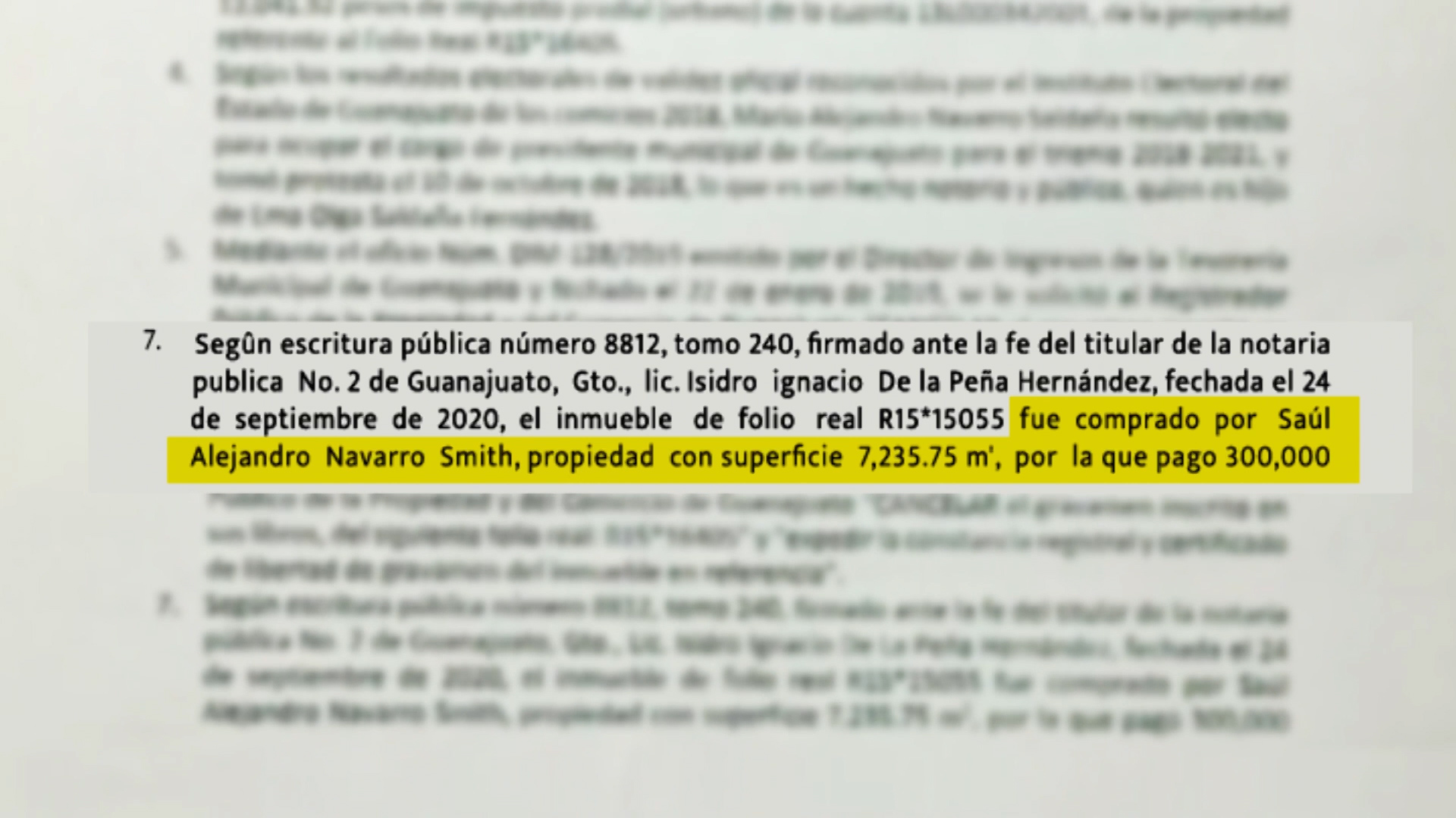 En su declaración ante el Ministerio Público, Robles Lacayo informó que el hijo del ex presidente Alejandro Navarro, compró en 300 mil pesos una propiedad inmueble de 7,500 metros cuadrados, ubicada en la sierra de Santa Rosa del municipio de Guanajuato, con un valor fiscal de 2,150,342.98 pesos.