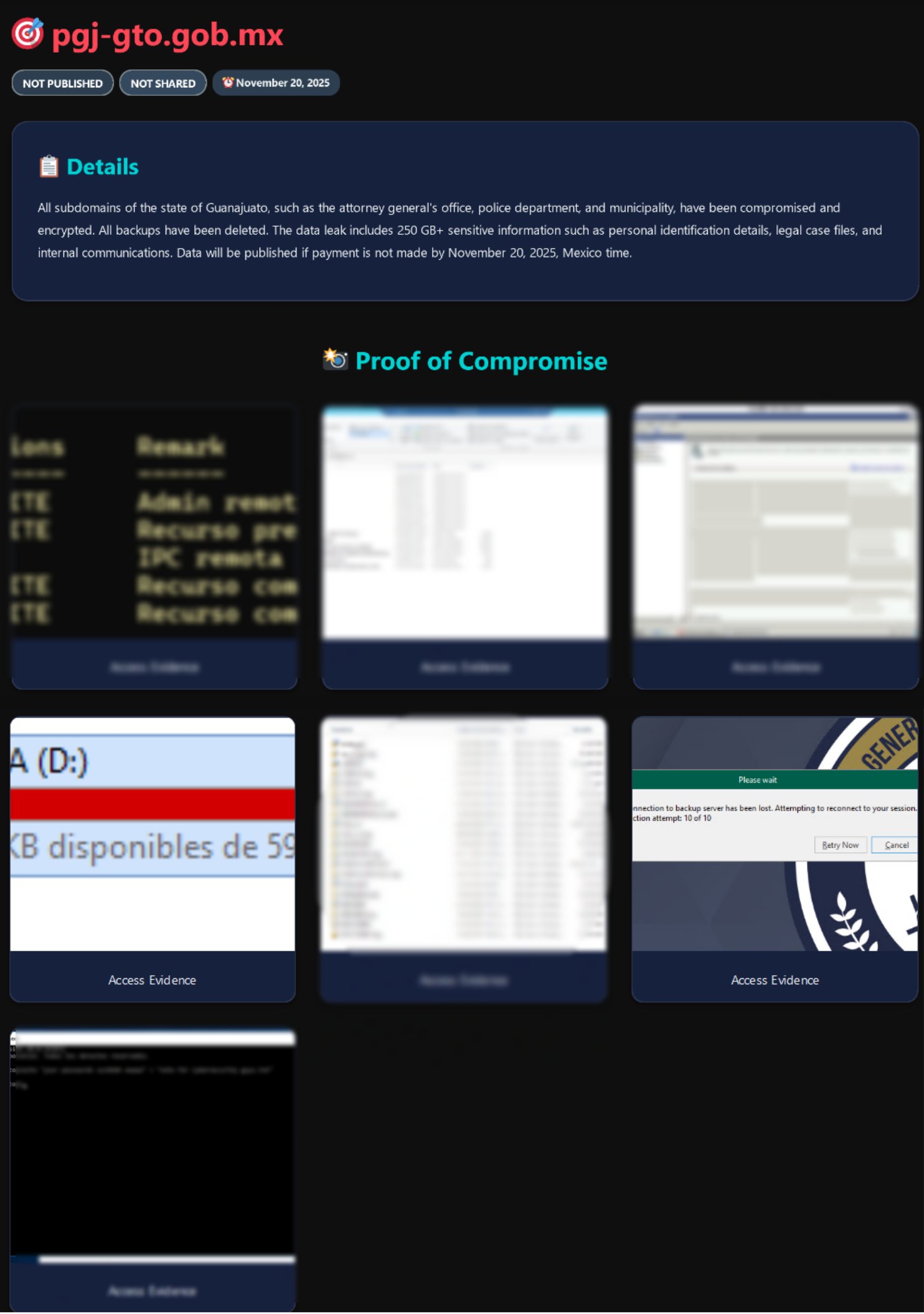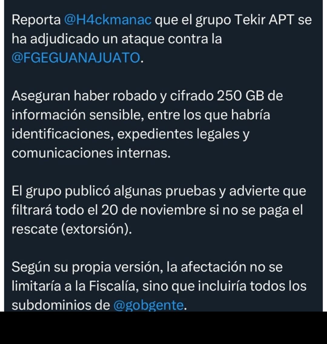 No obstante, según Hackmanac en su página de X, confirmó que el grupo Tekir ATP se ha adjudicado el ataque y que ha robado 250 gigabites de información sensible que será revelada el próximo 20 de noviembre si no se realiza el pago de un rescate (sin precisar montos) y que no sólo se limita a la Fiscalía, sino que todo el domino y subdominios "gobgente".