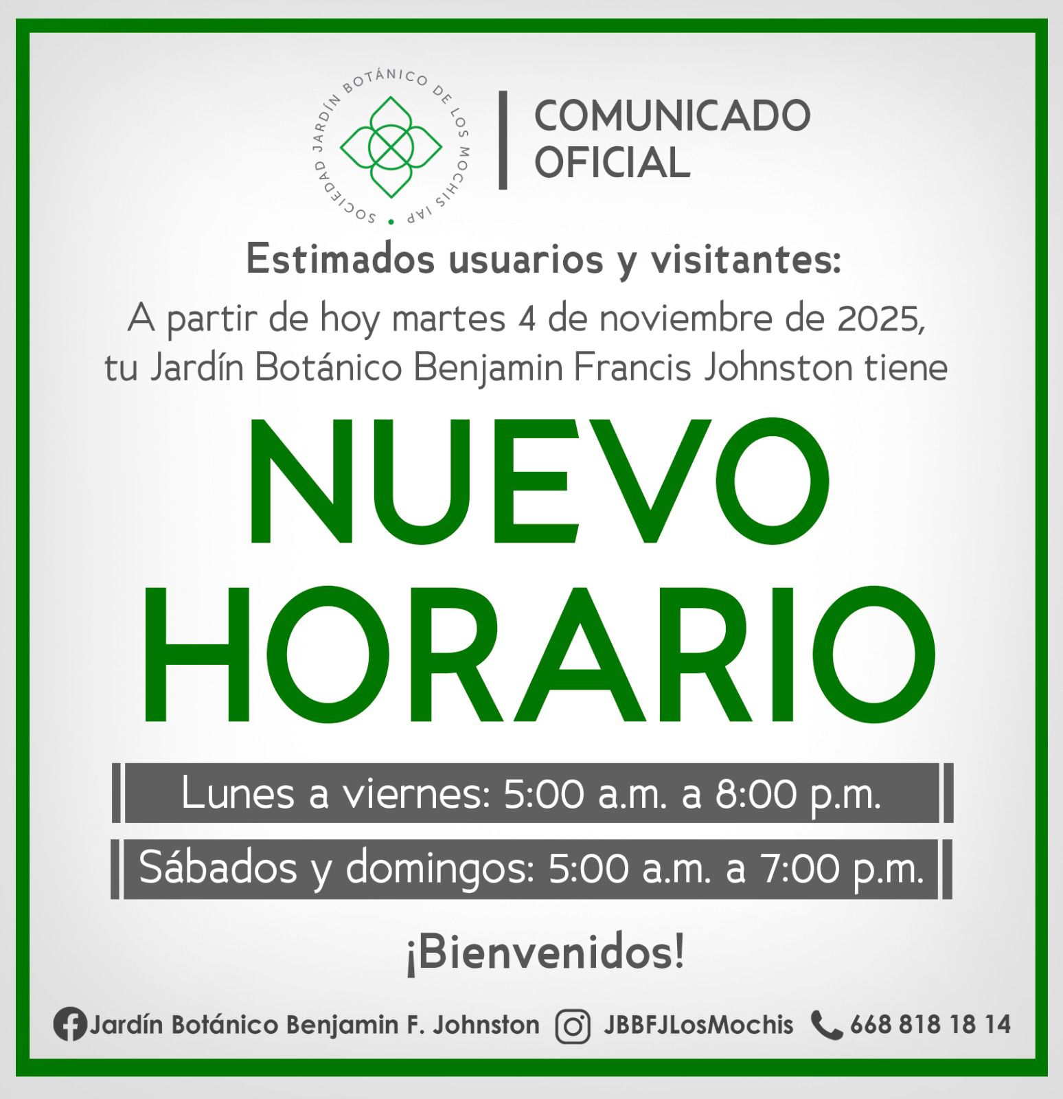 Como parte de la actualización de servicios del Parque Sinaloa y su Jardín Botánico Benjamín Francis Johnston a partir de este martes 4 de noviembre de 2025, entrará en vigor un nuevo horario de atención para todos los visitantes.