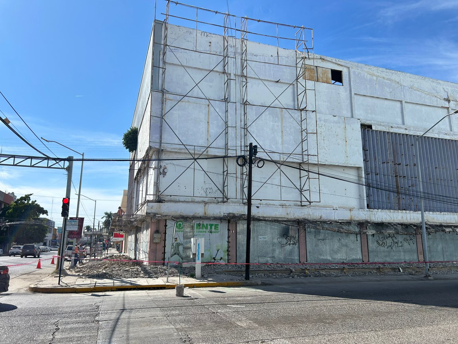Luego de varios reportes y accidentes ocasionados por desprendimientos estructurales, finalmente elementos de Protección Civil derribaron este martes la marquesina de la tienda "La Violeta", ubicada en el Centro de la ciudad de Los Mochis.