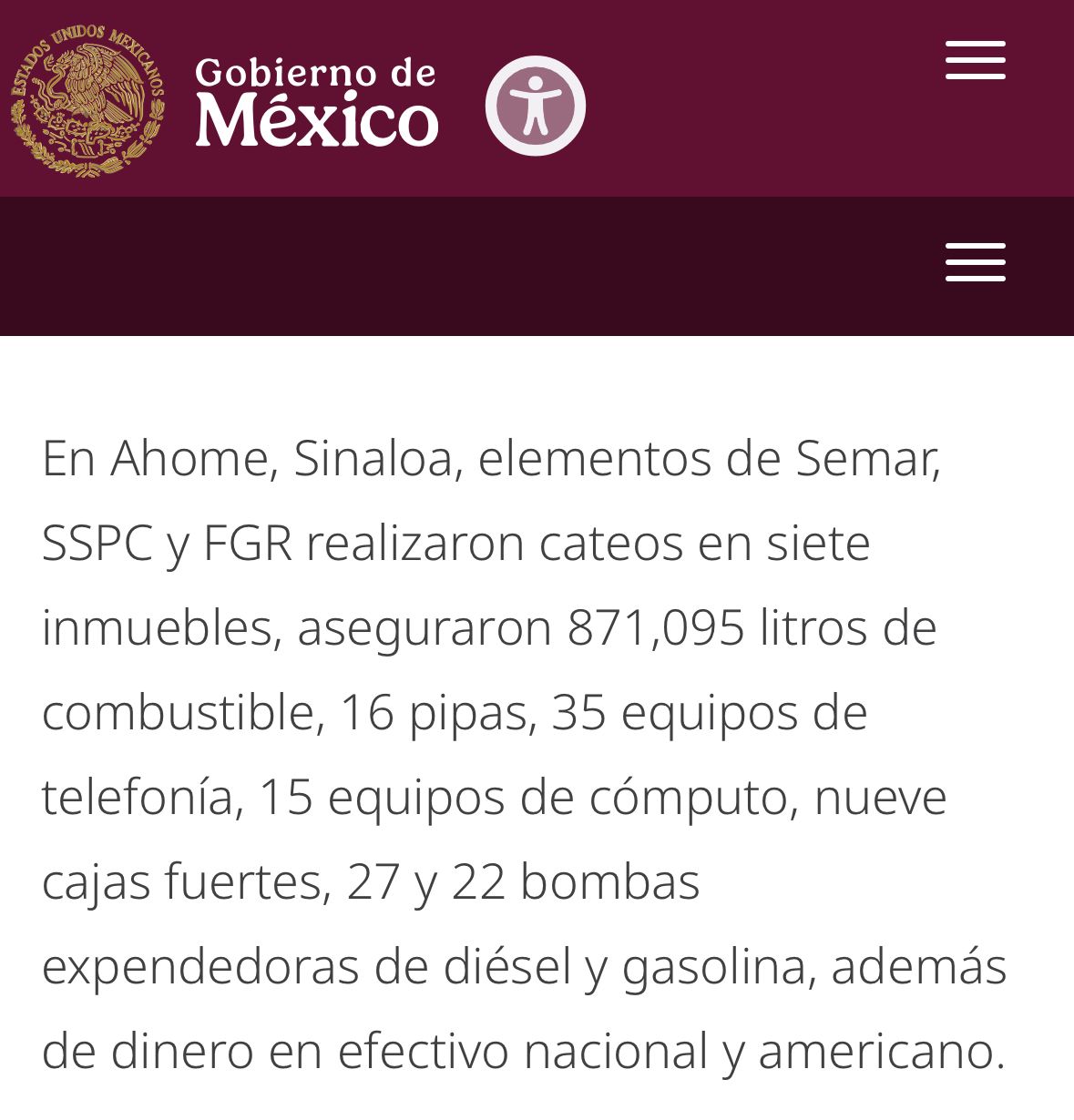 "Como parte de la estrategia para el combate al mercado ilícito de combustibles, los trabajos de inteligencia y vigilancia terrestre y análisis financiero permitieron ubicar inmuebles, tractocamiones, logísticas vinculadas a este delito. Destacan tres operativos realizados en Oaxaca, Nuevo León y Sinaloa que dieron como resultado más de un millón 400 mil litros de hidrocarburo, ocho tanques de almacenamiento, 16 pipas, 46 bombas expendedoras de diésel y gasolina".