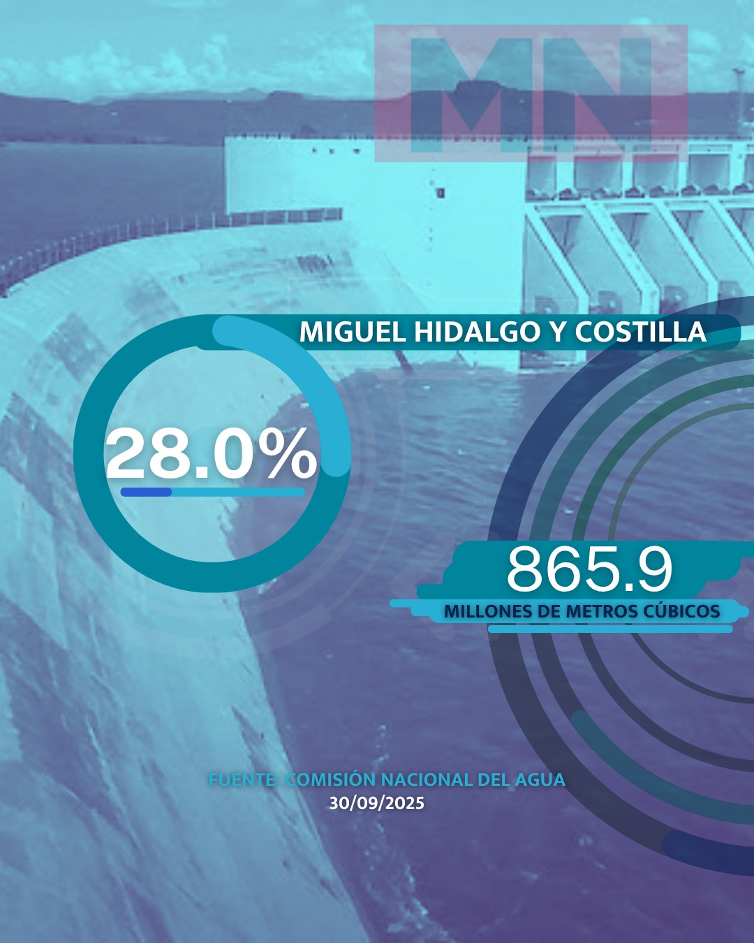 Presa Miguel Hidalgo y Costilla: Se encuentra al 28.0 %, con 865.9 millones de metros cúbicos almacenados.