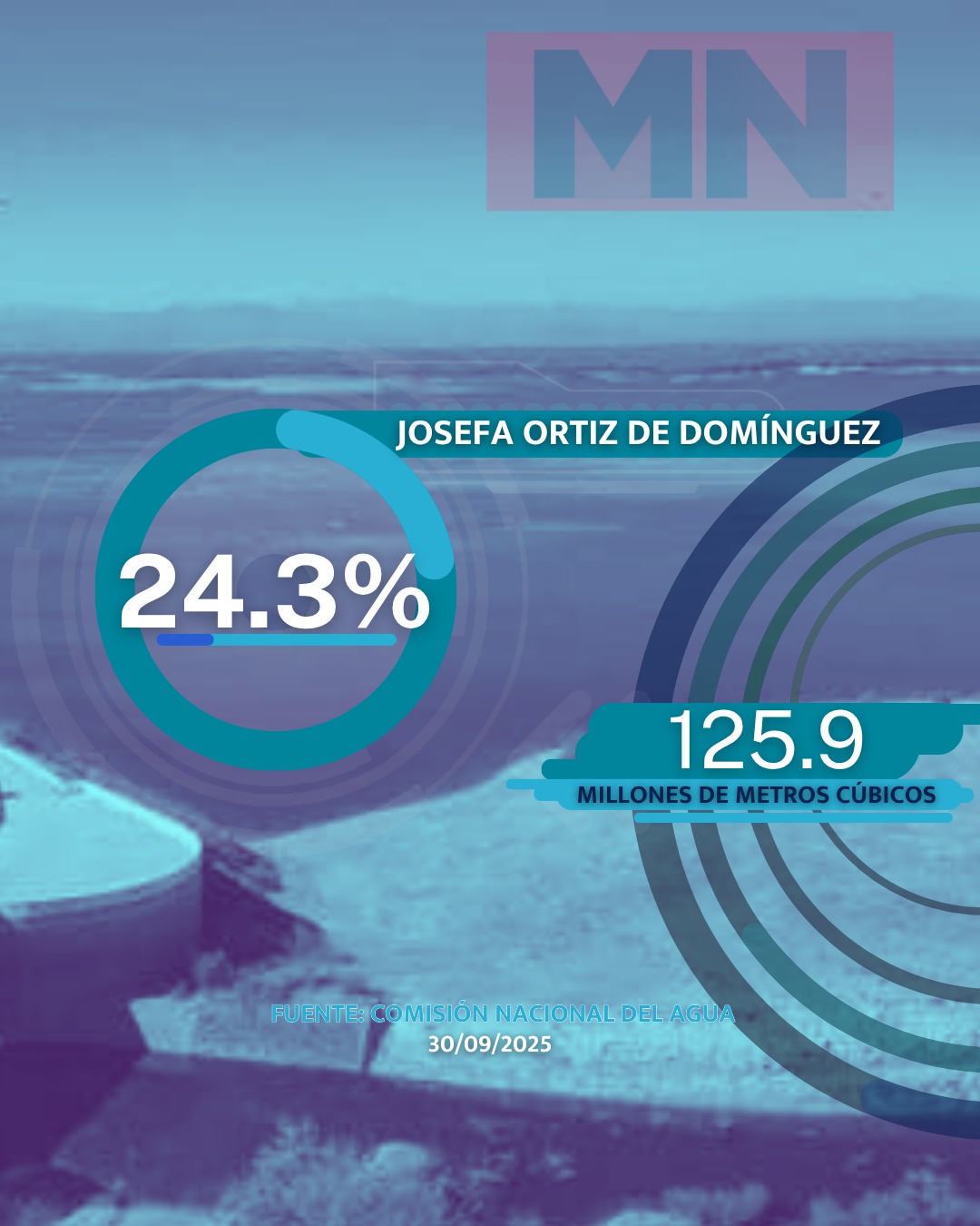Presa Josefa Ortiz de Domínguez: Registra un almacenamiento de 125.9 millones de metros cúbicos, equivalente al 24.3 % de su capacidad.