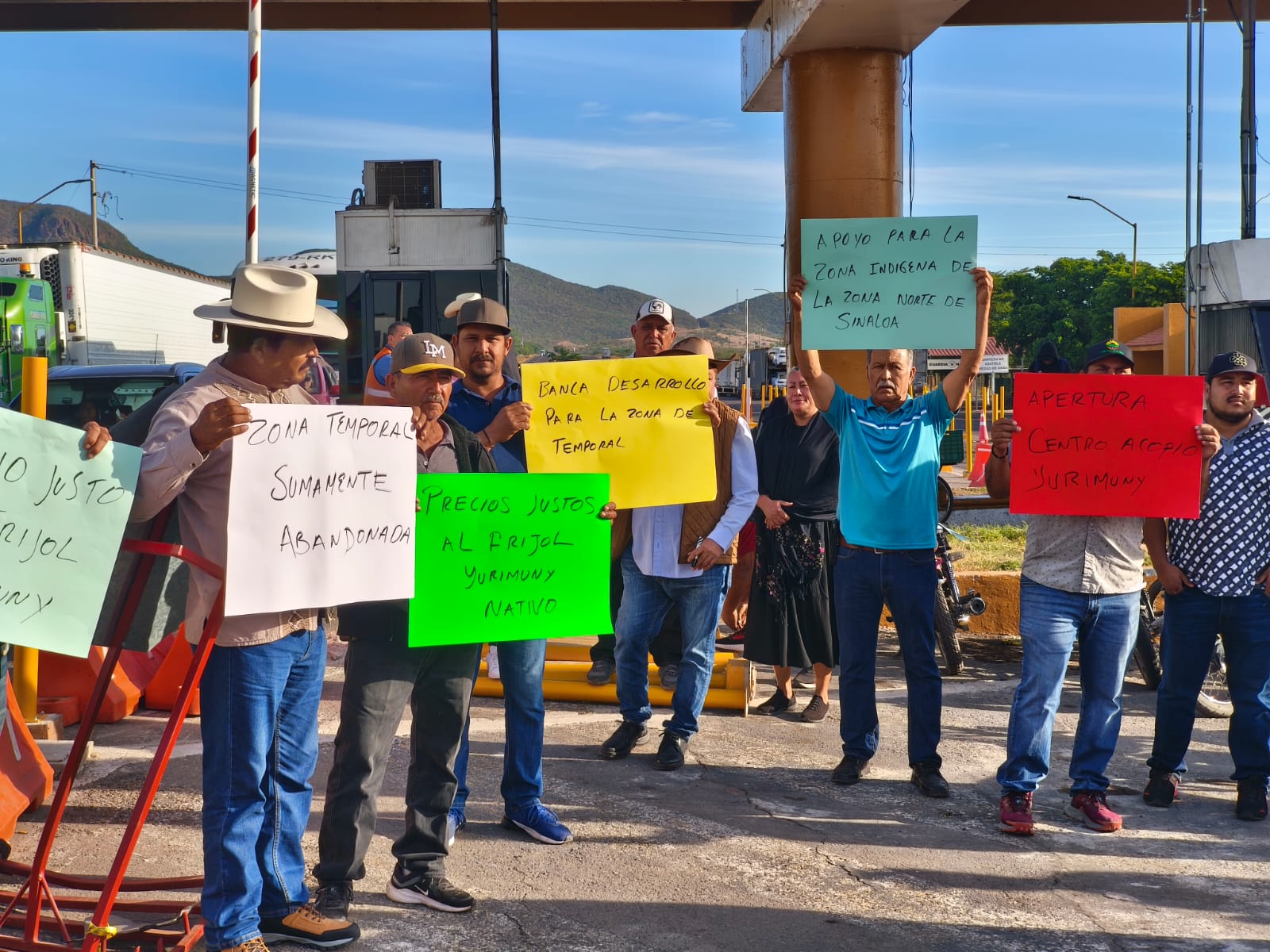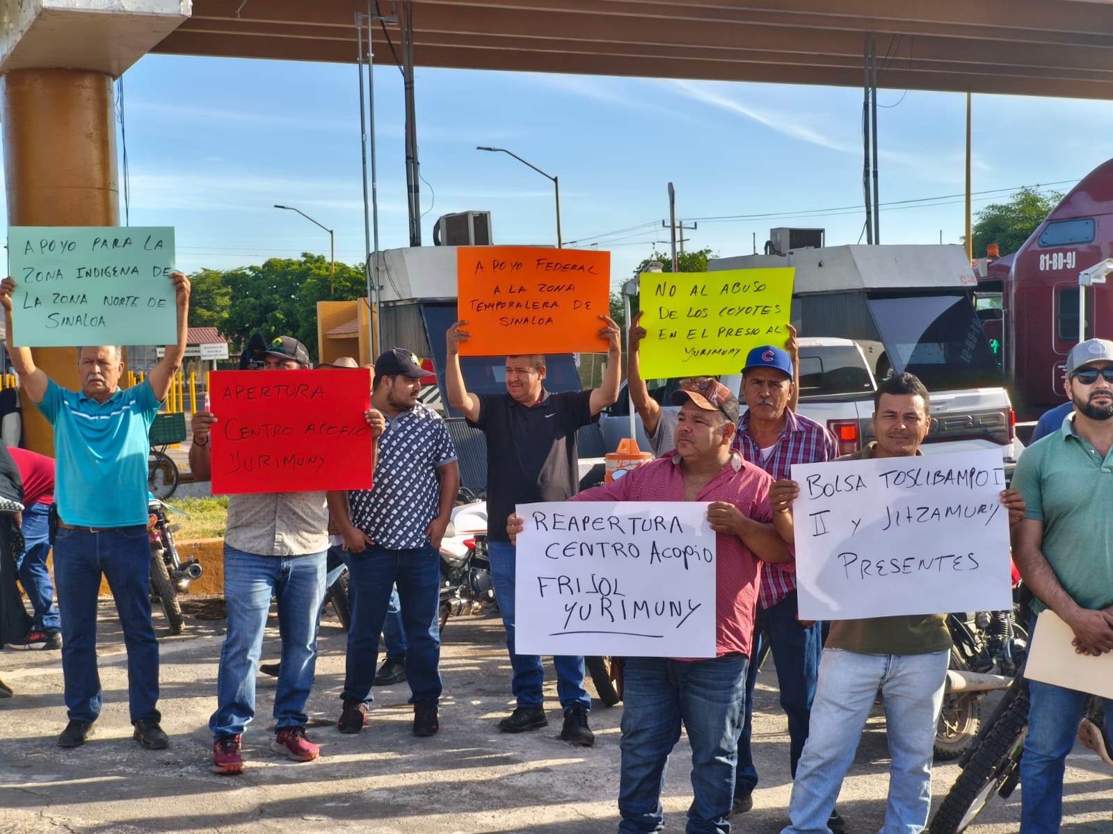 La mañana de este miércoles, decenas de productores de comunidades de la zona agrícola de Higuera de Zaragoza, en Ahome, se manifestaron en la caseta de cobro de San Miguel para exigir al Gobierno del Estado y al Gobierno Federal apoyos para el almacenamiento del frijol Yurimuni, tanto de la cosecha pasada como de la que está por levantarse en los próximos meses.
