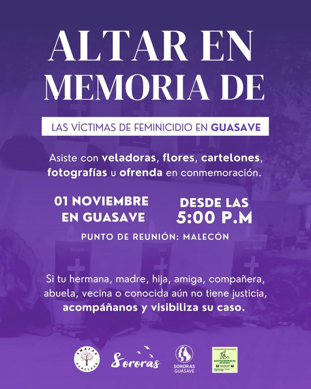 Diversos colectivos feministas, entre ellos Sororas Guasave, Amapas Rebeldes, Sororas Sinaloa y Rastreadoras Guasave, convocan a la ciudadanía a participar en la instalación de un Altar en Memoria de las Víctimas de Feminicidio, que tendrá lugar el 1 de noviembre a las 5:00 de la tarde, en el Malecón María del Rosario Espinoza, en Guasave.