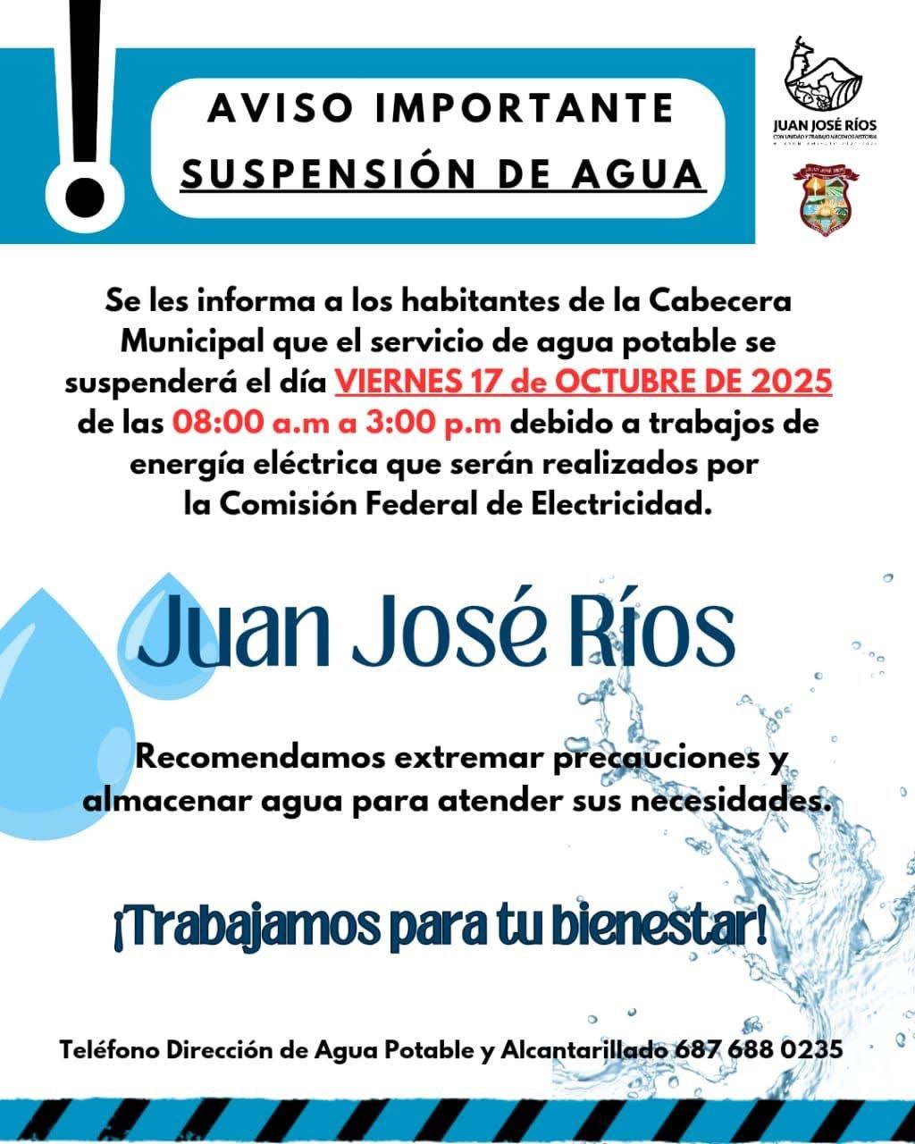 GUASAVE, SINALOA.- La Comisión Federal de Electricidad (CFE) realizará un corte programado de energía en la planta potabilizadora de Juan José Ríos, así lo informó la Dirección de Agua Potable y Alcantarillado Municipal en un comunicado a través de sus redes oficiales.
