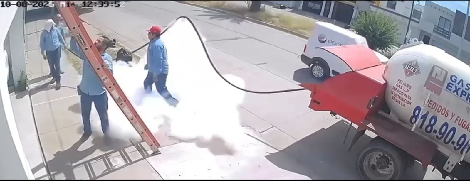 El incidente ocurrió sobre el boulevard principal del fraccionamiento. Un residente que se disponía a recargar su tanque en el techo de su casa logró captar el momento exacto del accidente mediante las cámaras de seguridad de su domicilio, evidenciando la magnitud de la fuga.