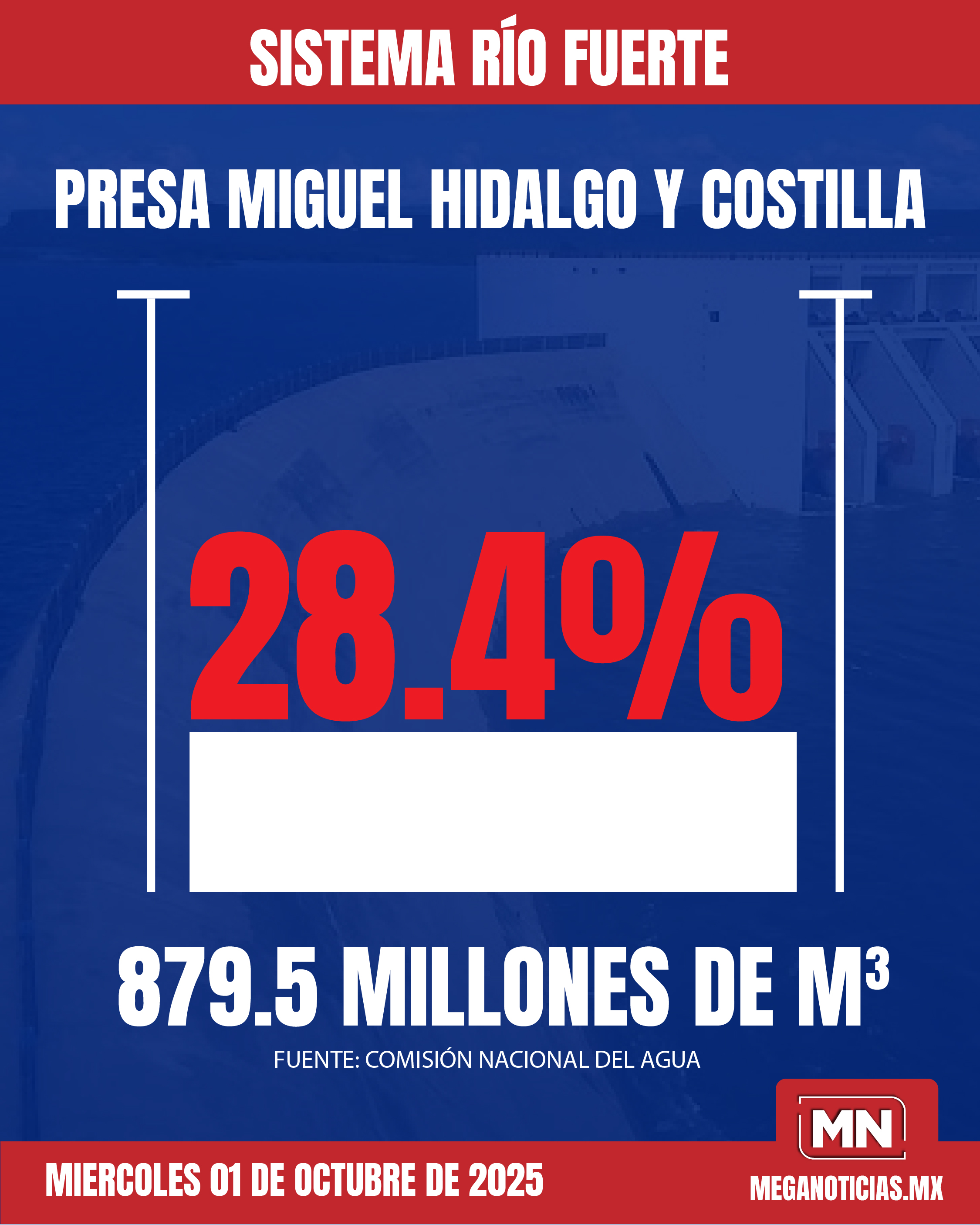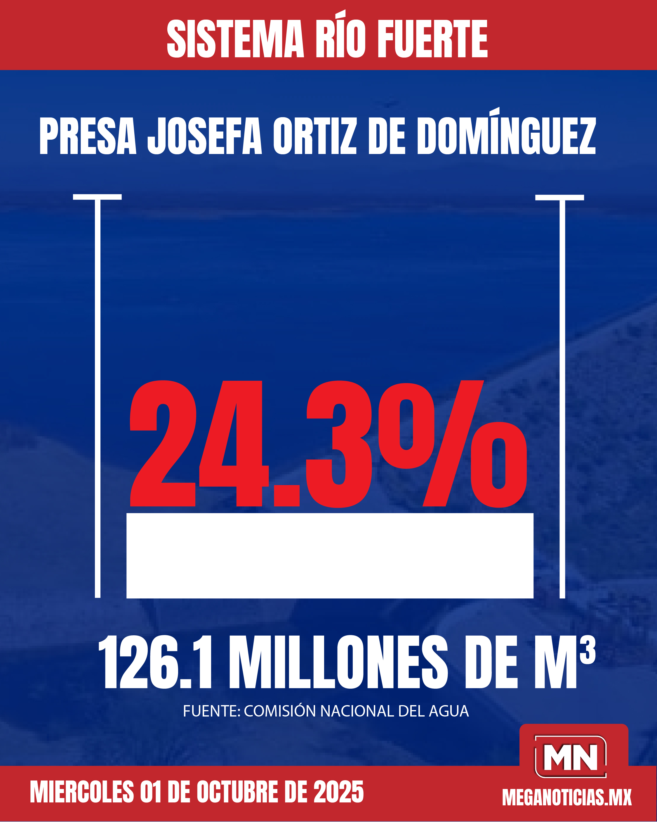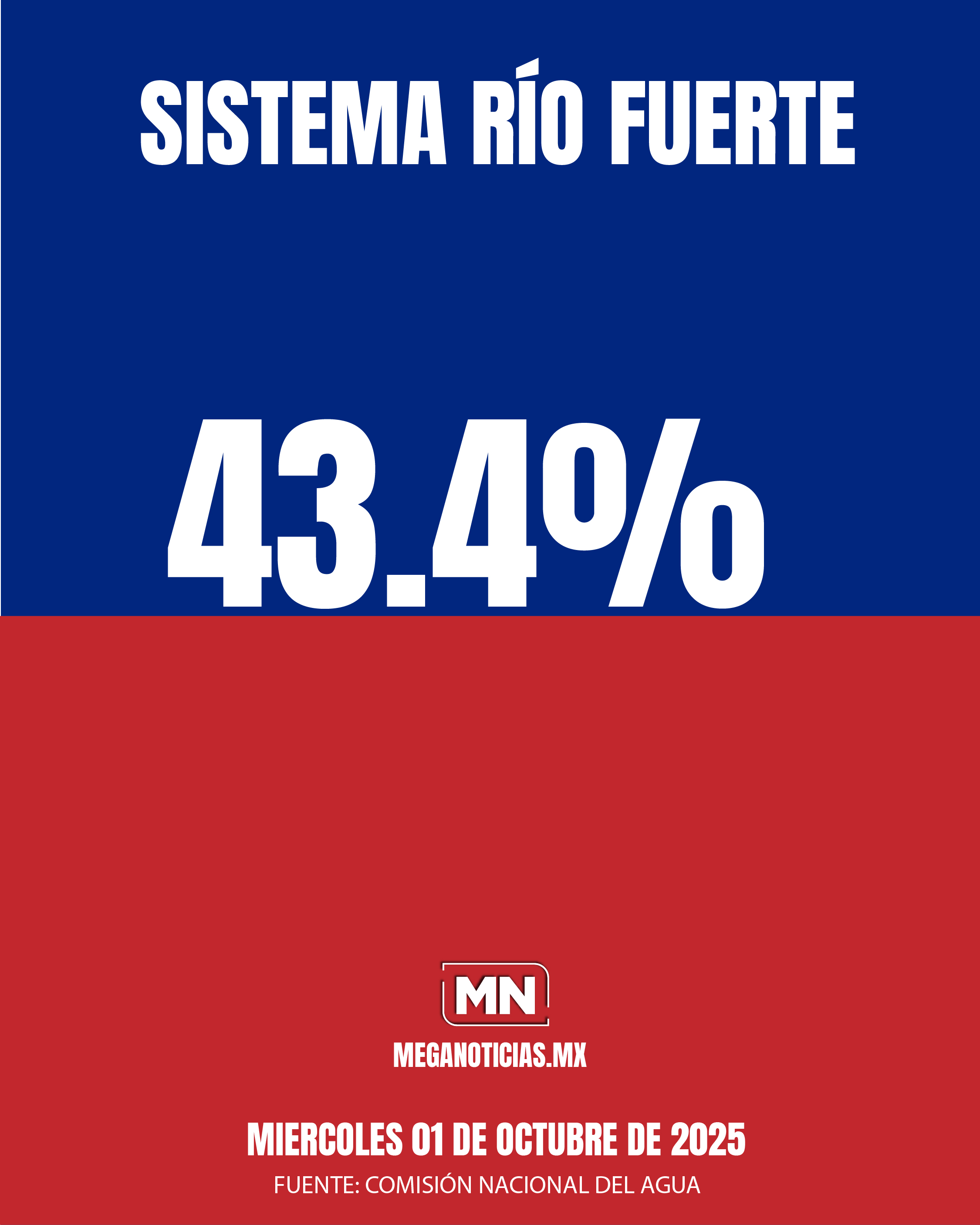 Este miércoles el sistema Río Fuerte registra un almacenamiento total de 2 mil 957.5 millones de metros cúbicos, lo que representa el 43.4% de su capacidad de conservación, según el último reporte de la Comisión Nacional del Agua (CONAGUA).