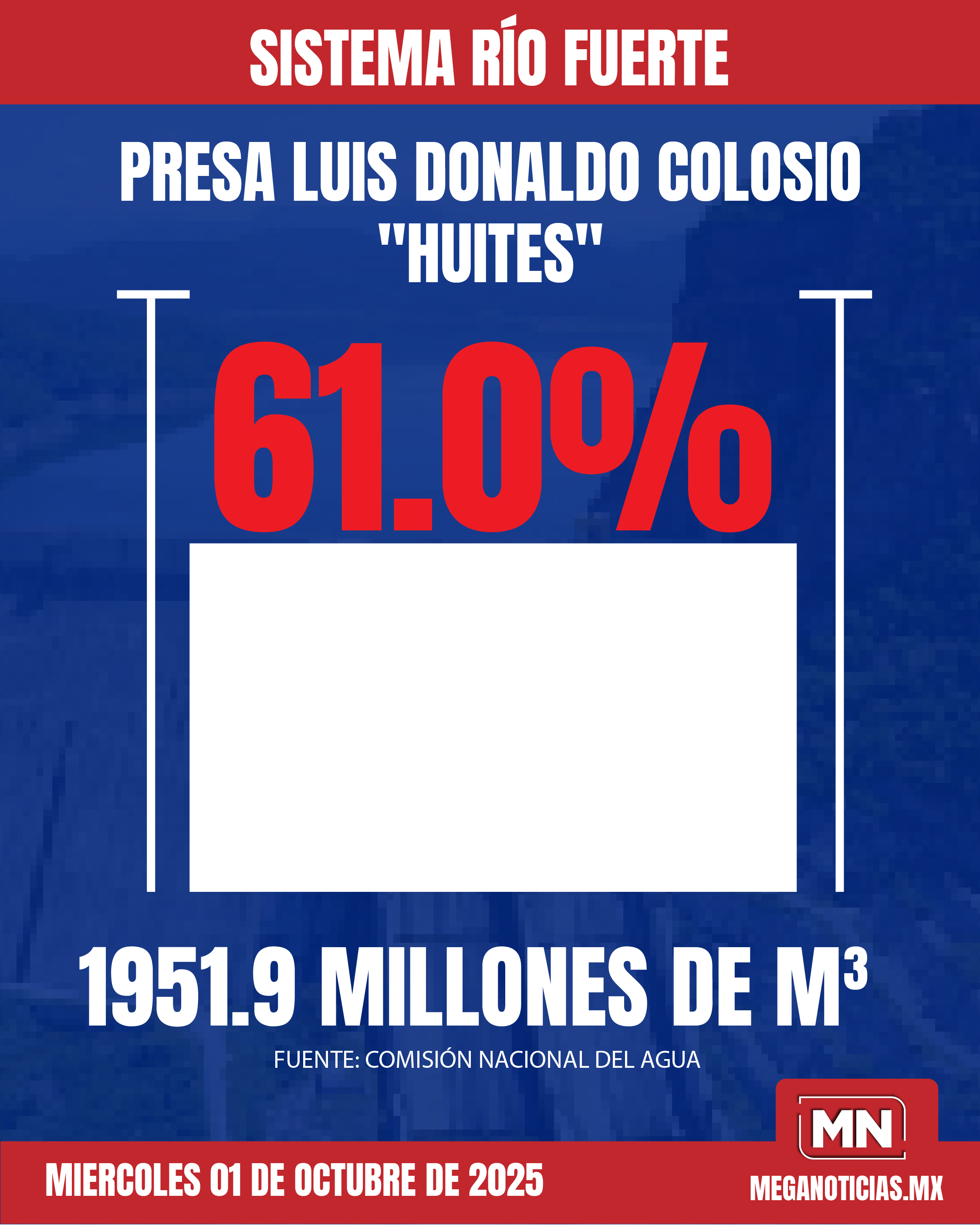 La presa Luis Donaldo Colosio conocida como "Huites" almacena 1,951.9 millones de metros cúbicos, equivalente al 61.0% de su capacidad de conservación.
