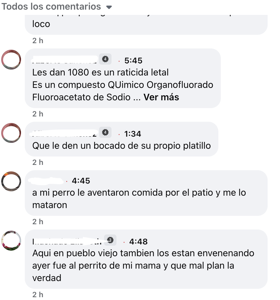 "Aquí en Pueblo Viejo también los están envenenando, ayer le envenenaron el perrito a mi mamá y qué mal plan, la verdad", manifestó Elianeth Machado una habitante de la comunidad Pueblo Viejo que señaló a través de las redes sociales que la situación ha sido recurrente y que los ataques parecen intencionales.