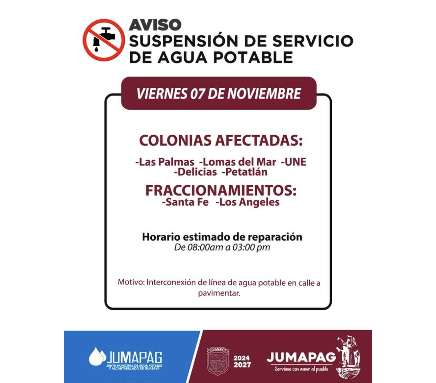 GUASAVE, SINALOA.- La Junta Municipal de Agua Potable y Alcantarillado de Guasave (Jumapag) suspenderá el servicio de agua potable en al menos 7 colonias del municipio de Guasave. La suspensión del servicio iniciará este viernes 7 de noviembre, en punto de las 8 de la mañana, con una duración de reparación estimada de 7 horas. Esta medida es debido a que se realizará interconexión de la línea de agua potable en calle a pavimentar.
