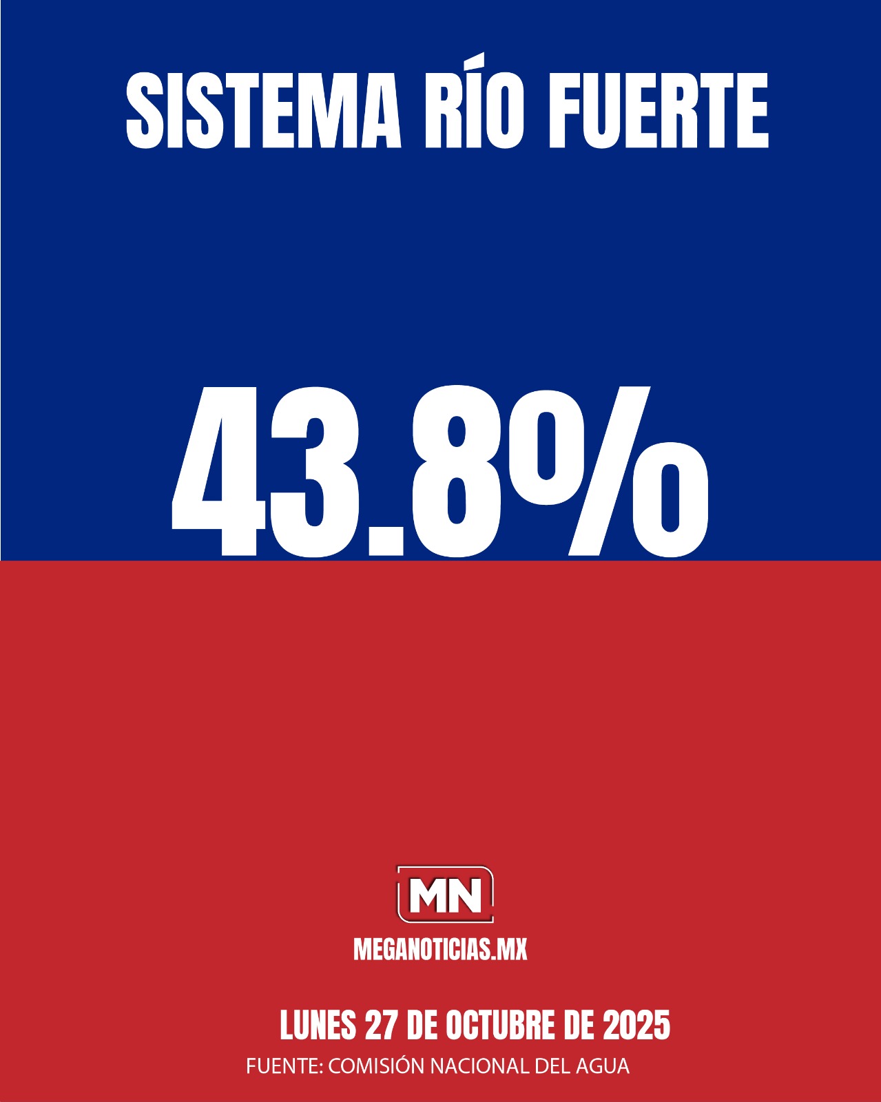 En total el sistema de presas Río Fuerte almacena actualmente 3078.4 millones de metros cúbicos , lo que representa el 43.8% de su capacidad total de conservación.