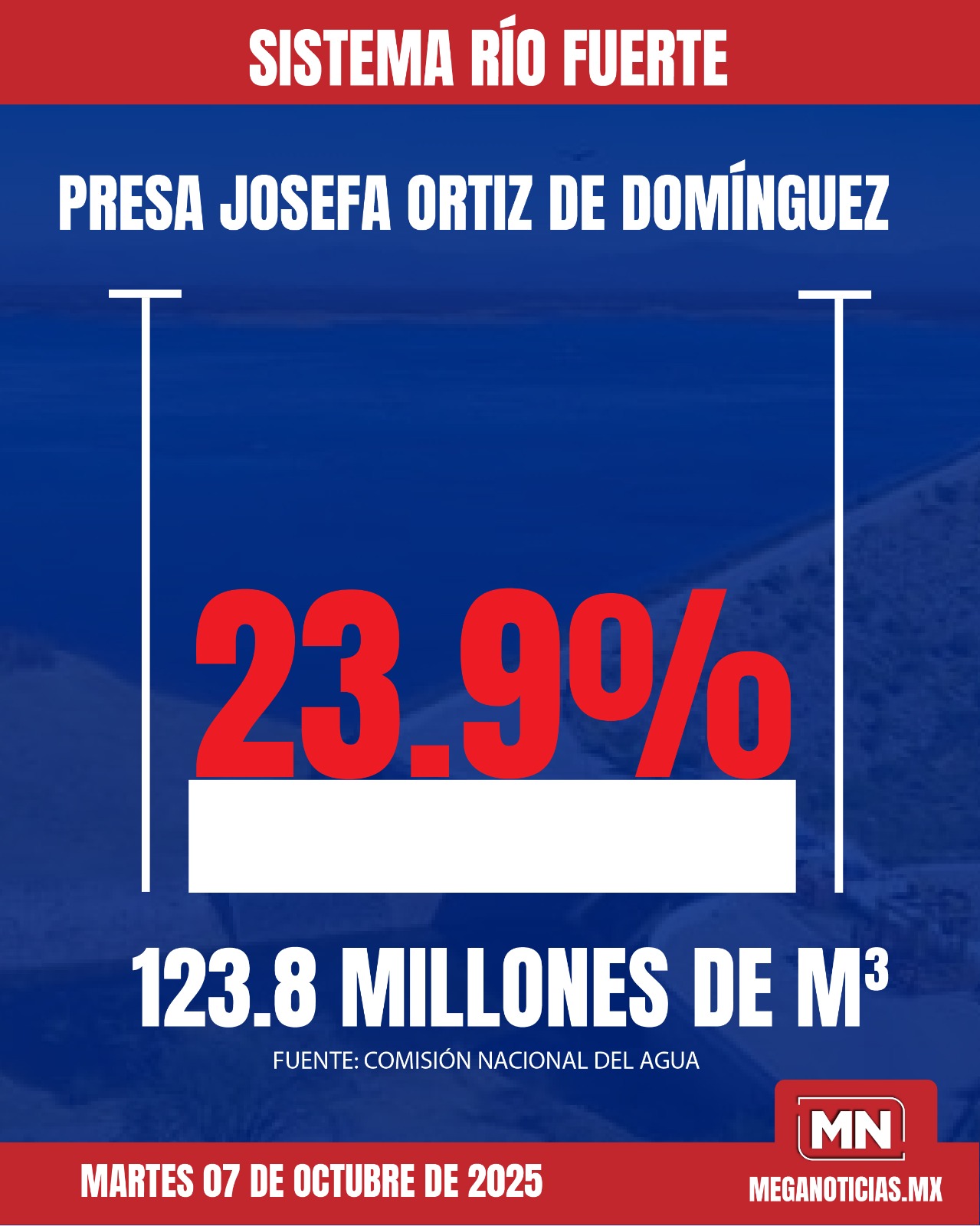 De acuerdo con información de la Comisión Nacional del Agua (Conagua), el sistema de presas del Río Fuerte almacena actualmente 3,012.2 millones de metros cúbicos , lo que representa el 43.3% de su capacidad total de conservación.