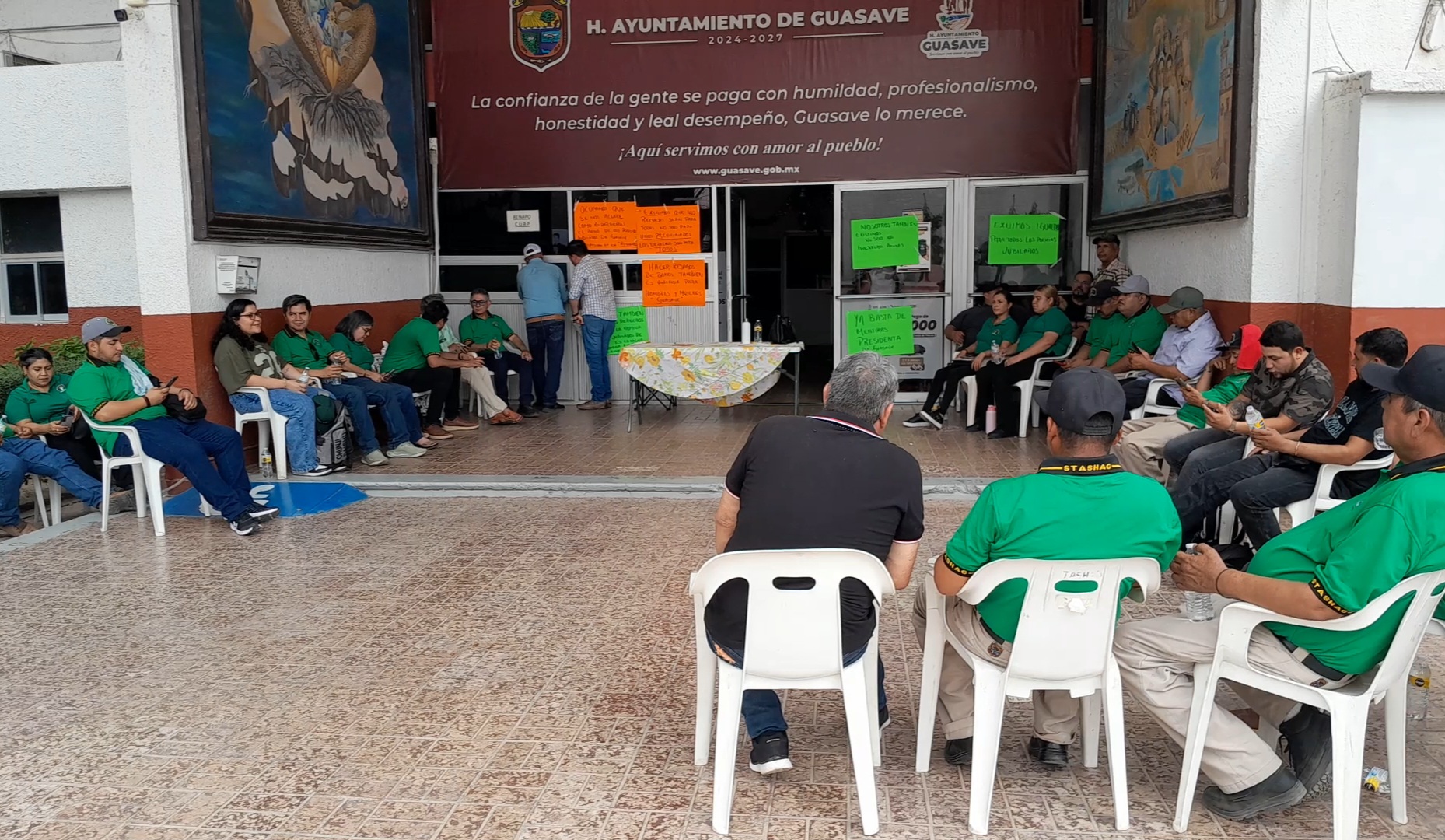 Guasave, Sinaloa.- Esta mañana, el Sindicato de Trabajadores al Servicio del H. Ayuntamiento de Guasave (STASHAG) y un grupo de policías jubilados se manifestaron frente al Palacio Municipal para exigir el pago de adeudos y el cumplimiento de los contratos colectivos.