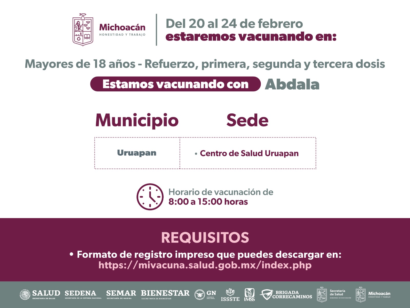 El horario de atención será de 08:00 a 15:00 horas y el requisito es llevar prellenado el formato de vacunación, que se puede descargar de la página https://mivacuna.salud.gob.mx/index.php.