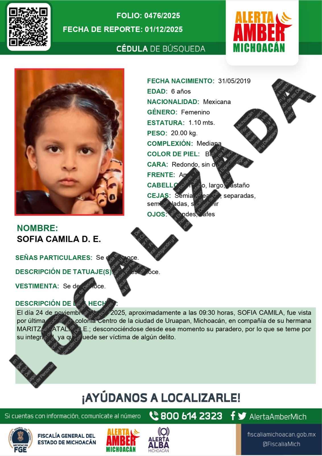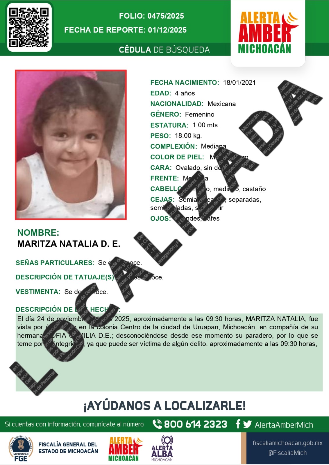 Como resultado de una acción operativa conjunta entre la Secretaría de Seguridad Pública (SSP) y las fiscalías de Michoacán y Nuevo León, fueron localizadas con vida las niñas Maritza Natalia D. y Sofía Camila D., y se detuvo a Luis Felipe "N", presunto responsable del delito de secuestro cometido en agravio de las menores y de Maritza Natalia E., quien fue localizada sin vida el pasado 29 de noviembre en Uruapan.