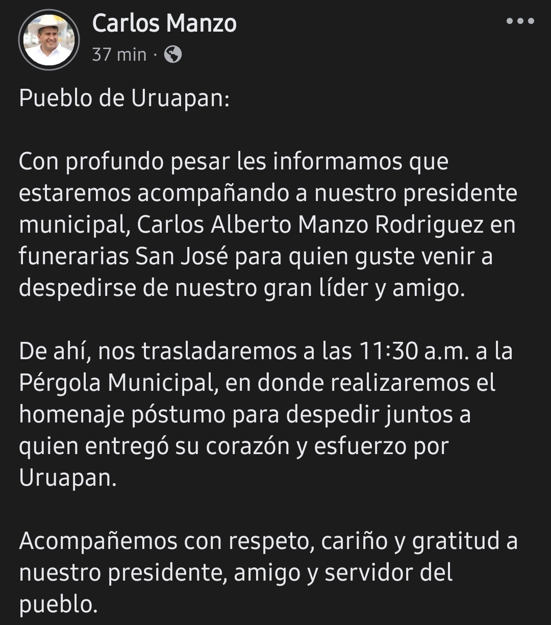 En una publicación, invitan a la ciudadanía a despedir al edil, informando que a las 11:30 a.m. realizaran un homenaje póstumo a Carlos Manzo en la Pérgola Municipal