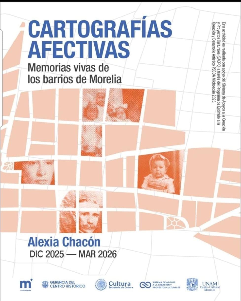 Con el objetivo de documentar como es la vida en los barrios del centro histórico de Morelia y los cambios que han tenido a través del tiempo, se realizará el proyecto de investigación y arte "Cartografías afectivas" por parte de Alexia Chacón. Se realizarán 6 laboratorios para los vecinos quienes podrán participar y aportar su visión, a través de archivos personales y la toma de fotografías para documentar su vida diaria.