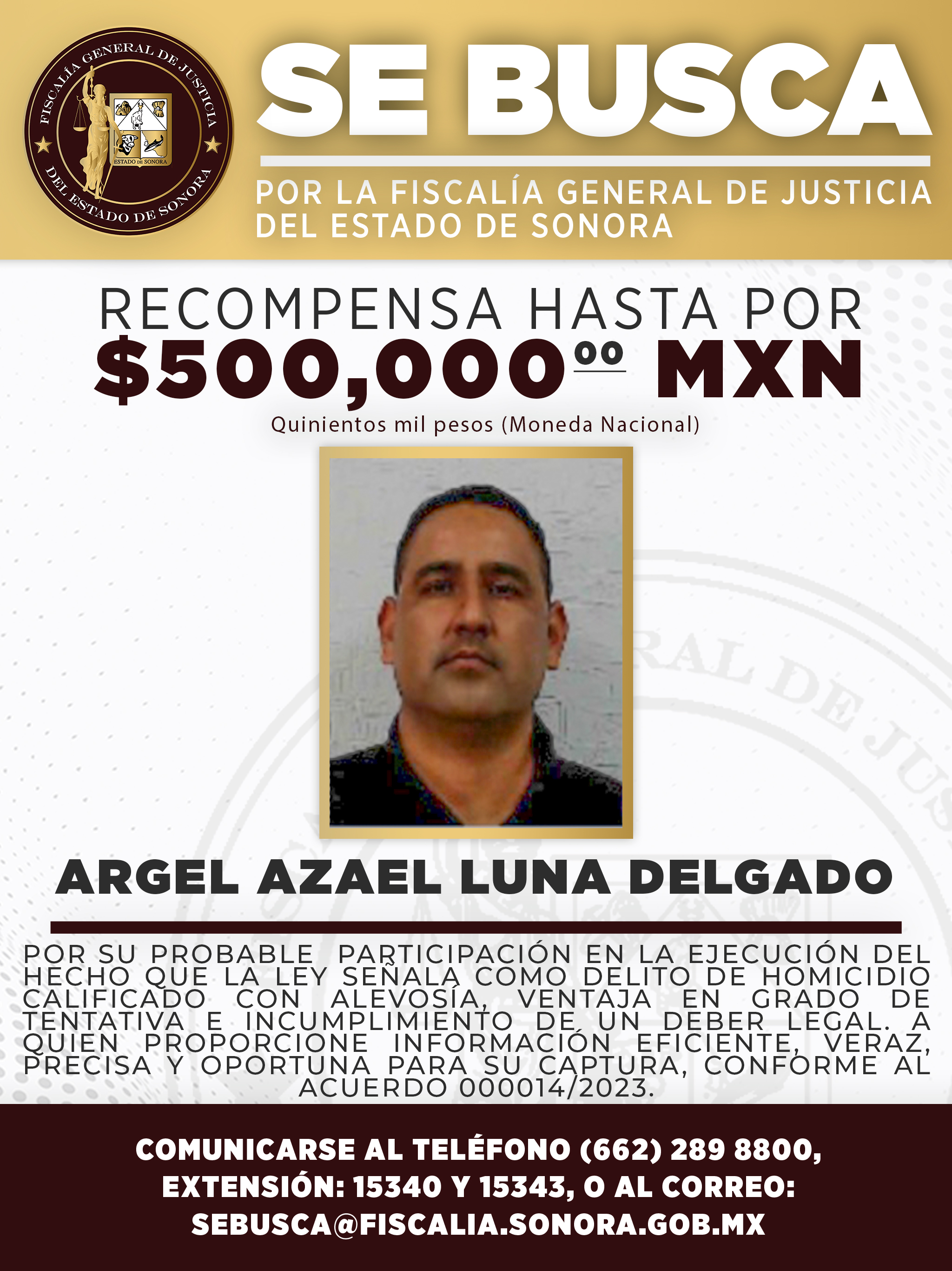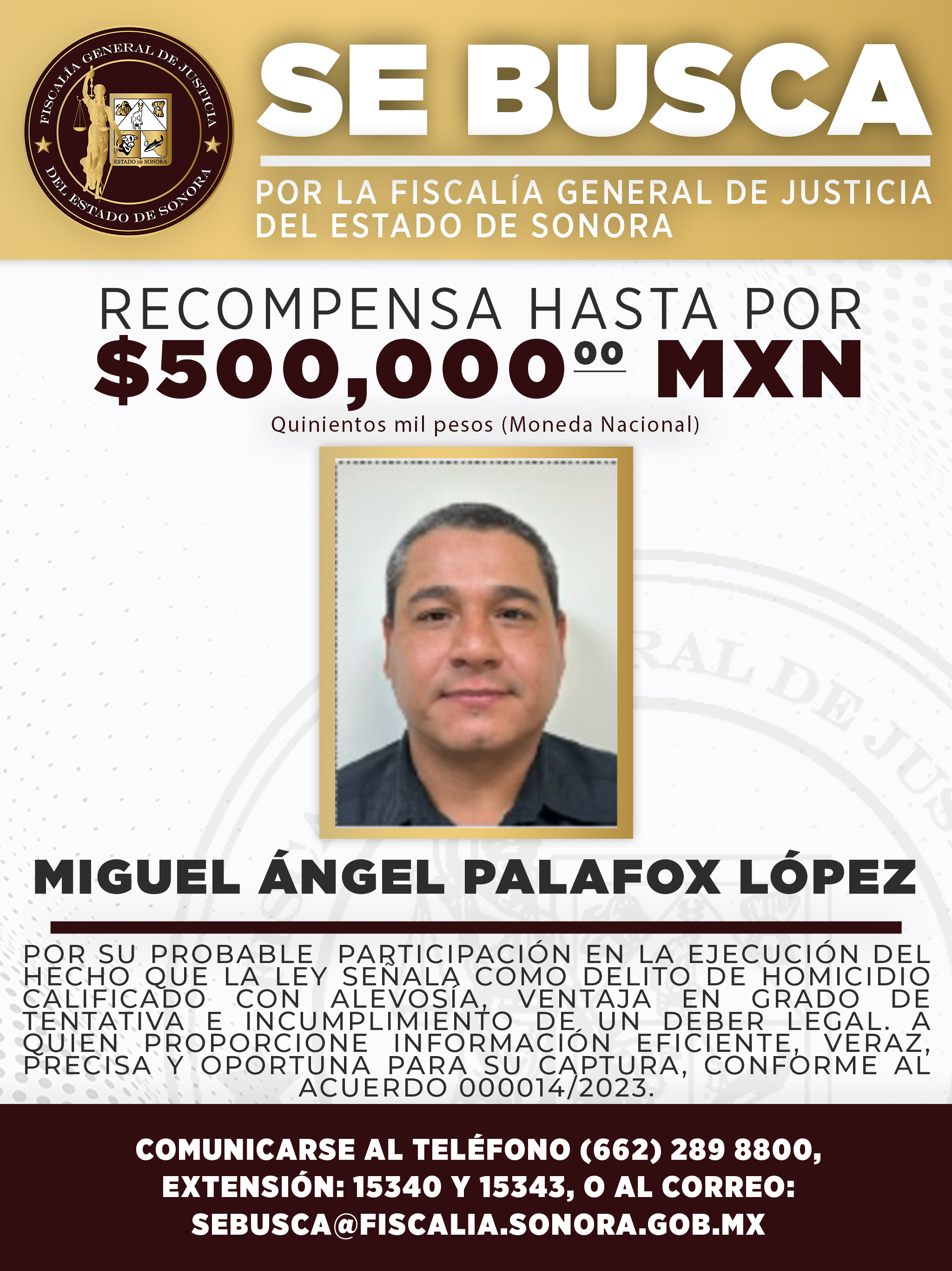 La Fiscalía General de Justicia del Estado de Sonora publicó este martes dos boletines de búsqueda en los que ofrece una recompensa de hasta 500 mil pesos por información que lleve a la captura de Argel Azael Luna Delgado y Miguel Ángel Palafox López, ambos agentes de la Agencia Ministerial de Investigación Criminal (AMIC).