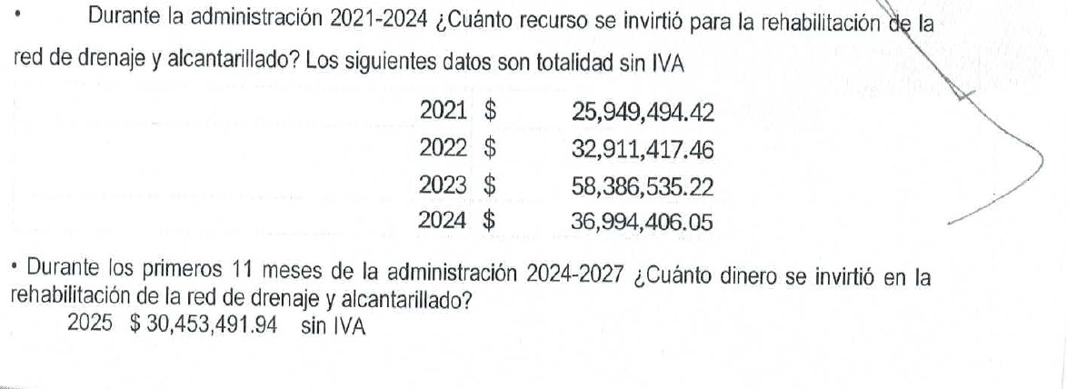 Entre 2021 y 2024, el municipio destinó más de 150 millones de pesos a rehabilitación de colectores y pavimentación. Durante los primeros meses de 2025 se han invertido 30 millones de pesos adicionales, y se proyectan 70 millones más para el resto de la administración, incluyendo infraestructura de agua potable y drenaje.