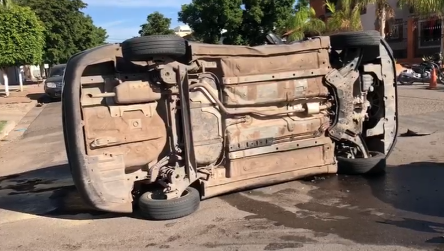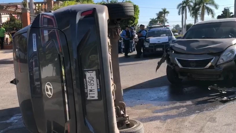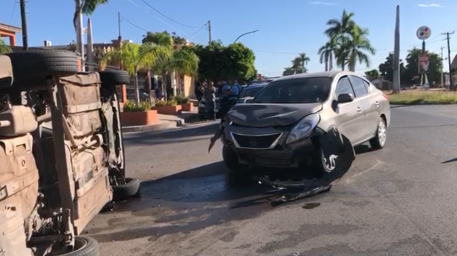 Un aparatoso choque con volcamiento generó una intensa movilización de cuerpos de emergencia la mañana de este miércoles en la colonia Mórelos de Ciudad Obregón. El incidente ocurrió en el cruce de las calles Náinari y Huatachive, una zona de alto flujo vehicular, donde dos sedanes colisionaron y uno de ellos terminó recostado sobre su costado izquierdo. A pesar del impacto, las autoridades confirmaron que no hubo personas lesionadas.