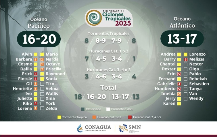 El 30 de noviembre de 2025 marcó de manera oficial el cierre de la Temporada de Ciclones Tropicales en las cuencas del Océano Pacífico y del Atlántico, finalizando también el periodo de lluvias asociadas a estos sistemas que afectaron diversas regiones de México. Desde el inicio del año, los pronósticos anticipaban una actividad considerable, estimando entre 16 y 20 ciclones con nombre para el Pacífico y de 13 a 17 para el Atlántico. Con el recuento final, se confirmó que la temporada no solo cumplió con las expectativas, sino que en algunos aspectos las superó.