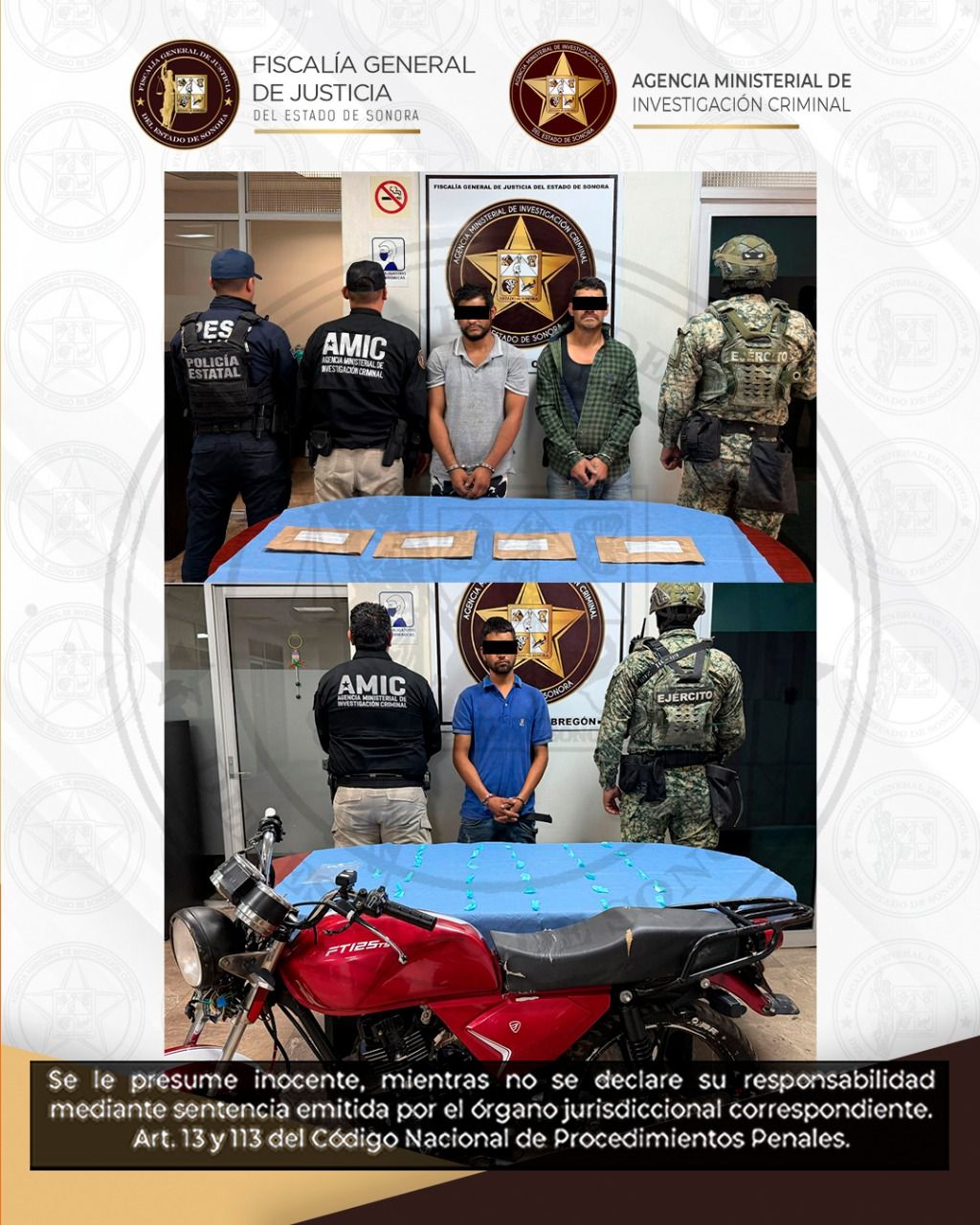 La Fiscalía General de Justicia del Estado de Sonora (FGJES) ejecutó dos operativos distintos en Ciudad Obregón, en coordinación con la Agencia Ministerial de Investigación Criminal (AMIC), la Policía Estatal de Seguridad Pública (PESP) y la Secretaría de la Defensa Nacional (SEDENA). Las acciones derivaron en la detención de tres personas relacionadas con narcomenudeo, así como el aseguramiento de droga y un vehículo.
