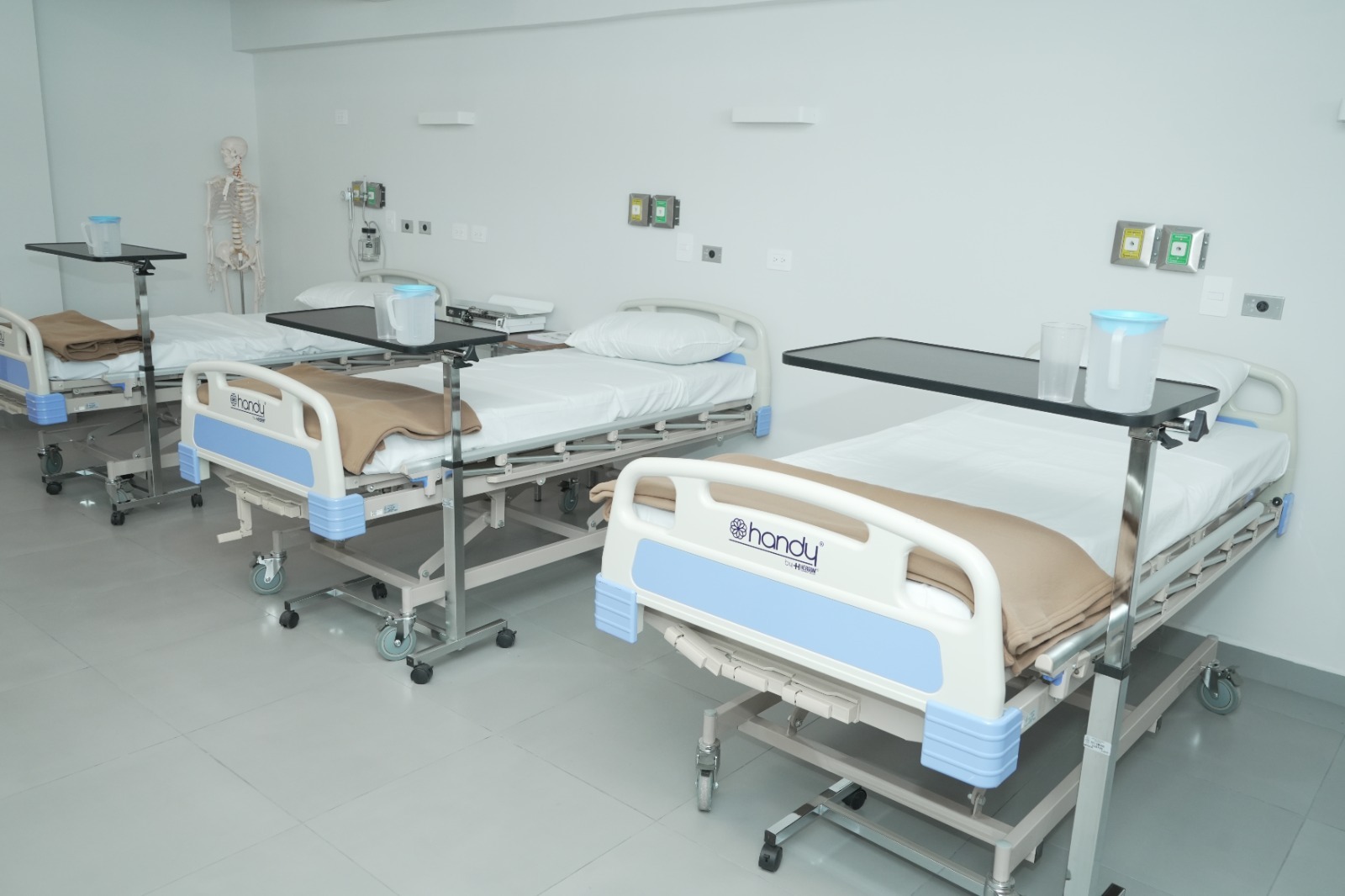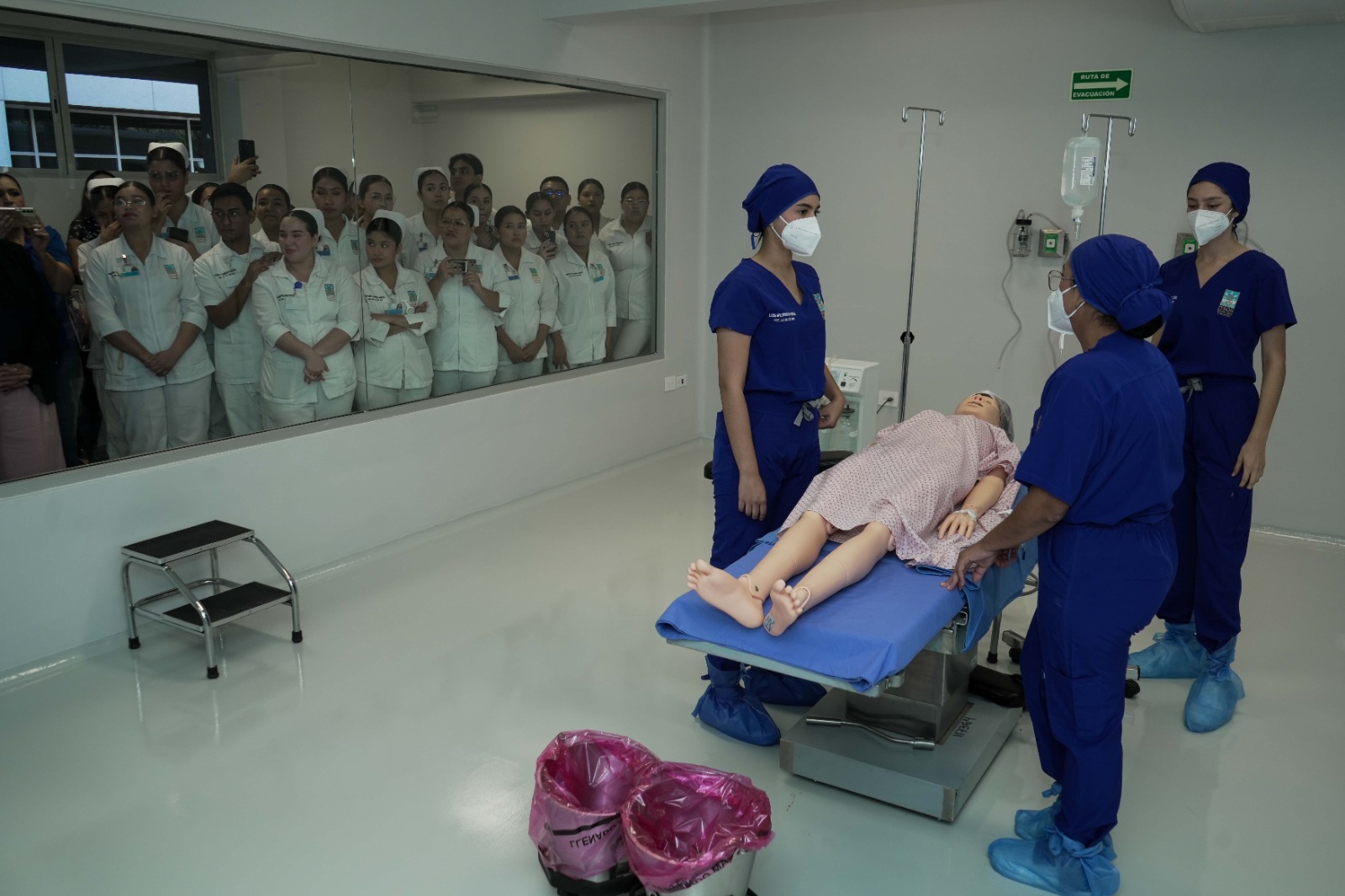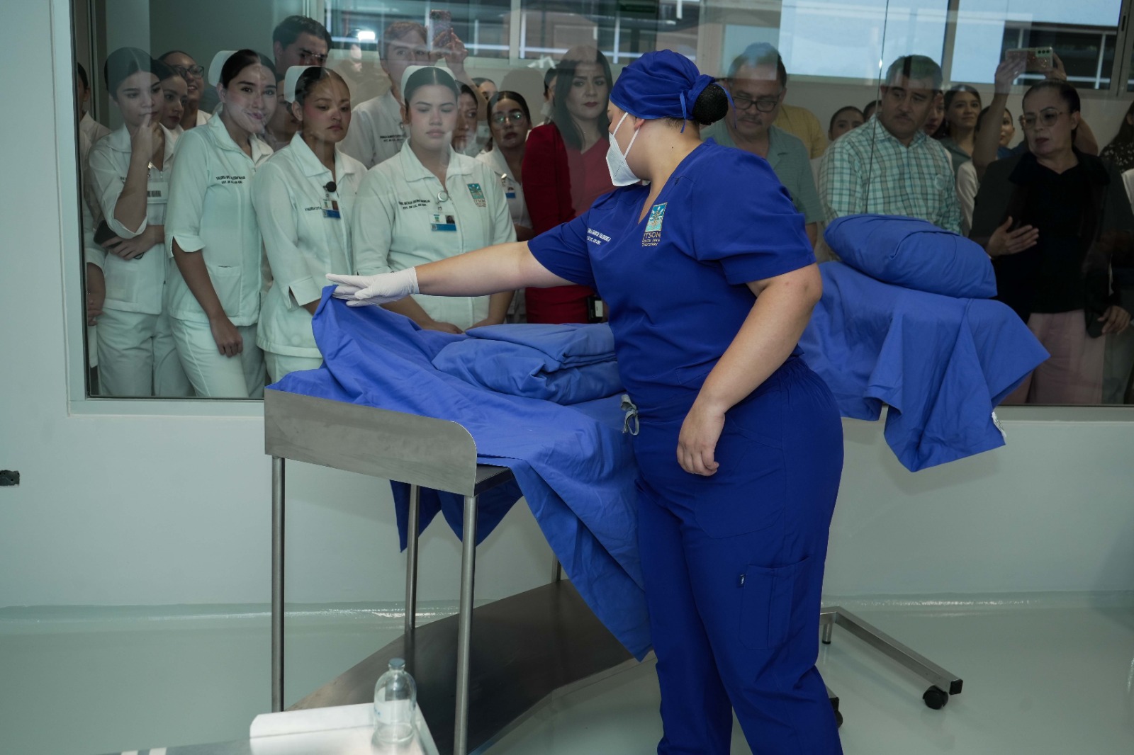 El Área de Hospitalización, donde las y los estudiantes practican cuidados básicos y especializados en pacientes adulto, pediátrico y materno. El Centro de Esterilización y Equipos (CEyE), enfocado en los procesos de desinfección y manejo de instrumental médico. Y la Sala Quirúrgica y de Parto, equipada para simulaciones de cirugía, atención obstétrica y escenarios de alta especialidad.