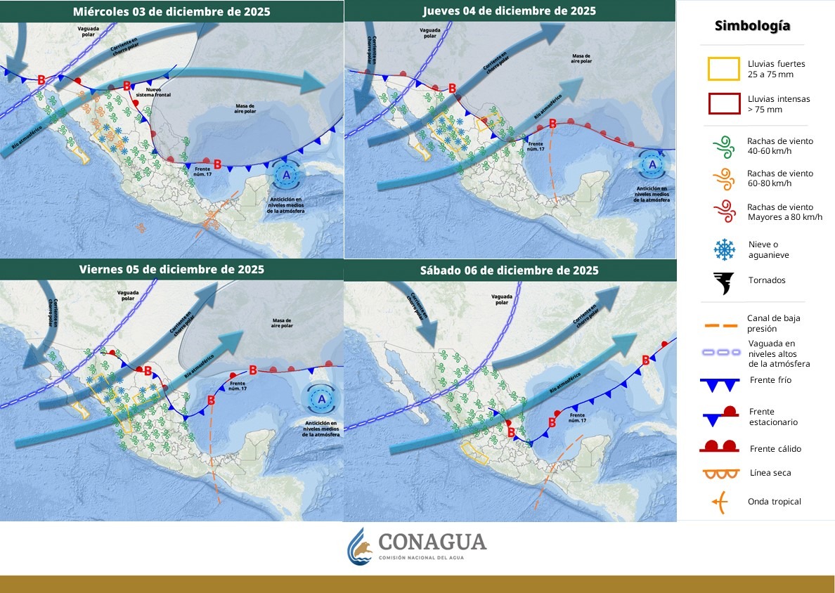 Para este jueves 4 de diciembre, un nuevo frente frío ingresará por la frontera norte, generando un descenso aún más marcado de temperatura. La CEPC señaló que este sistema podría ocasionar lluvias de ligeras a moderadas, rachas fuertes de viento y probabilidad de caída de nieve o aguanieve en la región montañosa.