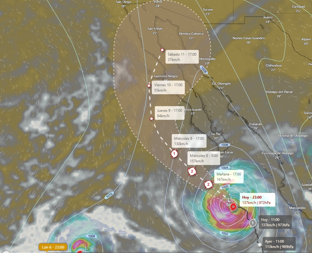 El titular de Protección Civil Municipal, Francisco Mendoza Calderón, explicó que, aunque el fenómeno se mantiene alejado de las costas de Sonora, sus efectos indirectos podrían provocar chubascos aislados y encharcamientos, principalmente durante la segunda mitad de la semana.