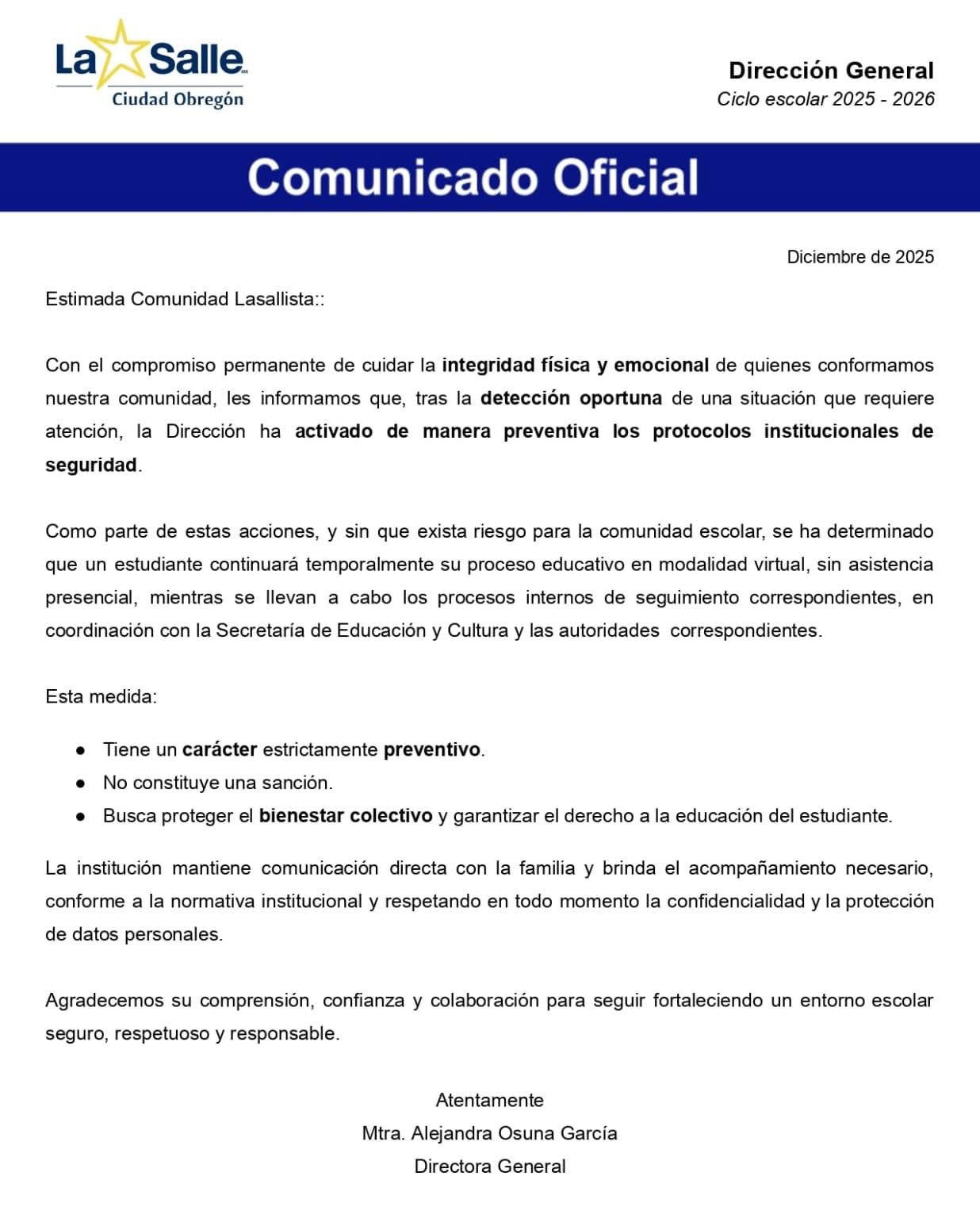 El comunicado oficial del Instituto La Salle dice lo siguiente: