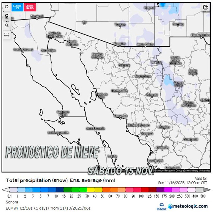 De acuerdo con el pronóstico del Servicio Meteorológico Nacional, el sistema frontal podría generar incluso caída de aguanieve o nieve en las zonas serranas de municipios como Cananea, Nogales, Yécora y Bacerac, donde las temperaturas podrían descender hasta los cero grados Celsius durante la madrugada.