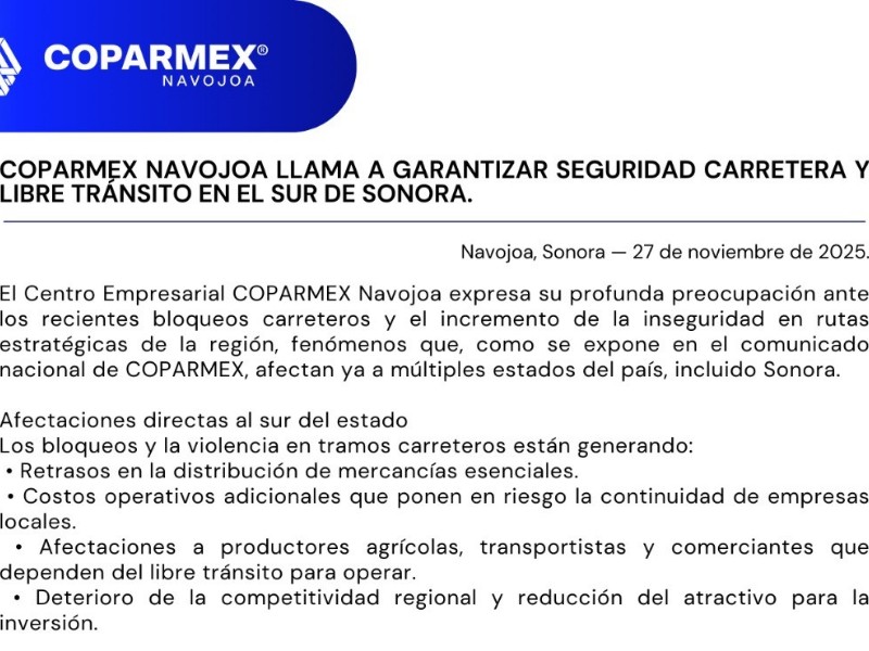 Bloqueos e inseguridad frenan la actividad económica en el sur de Sonora