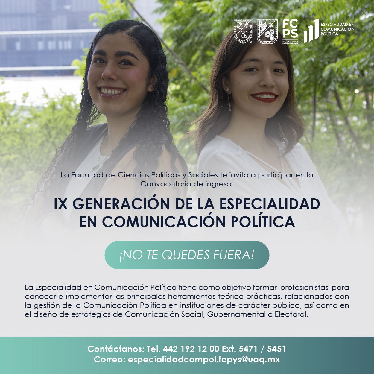 Desde este lunes 6 de octubre estará abierta la convocatoria para la especialidad en Comunicación Política, posgrado ofertado por la Facultad de Ciencias Políticas y Sociales (FCPS) de la Universidad Autónoma de Querétaro (UAQ).
