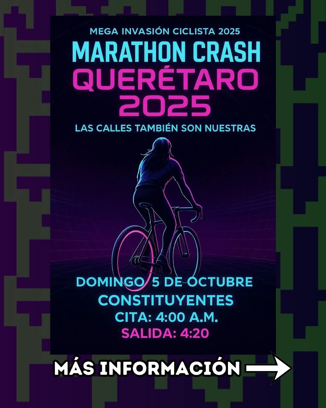 Este domingo 5 de octubre se realizará el Marathon Crash Querétaro 2025, un evento para ciclistas que partirá desde el Little Caesars de avenida Constituyentes, tras pasar avenida Luis Pasteur.